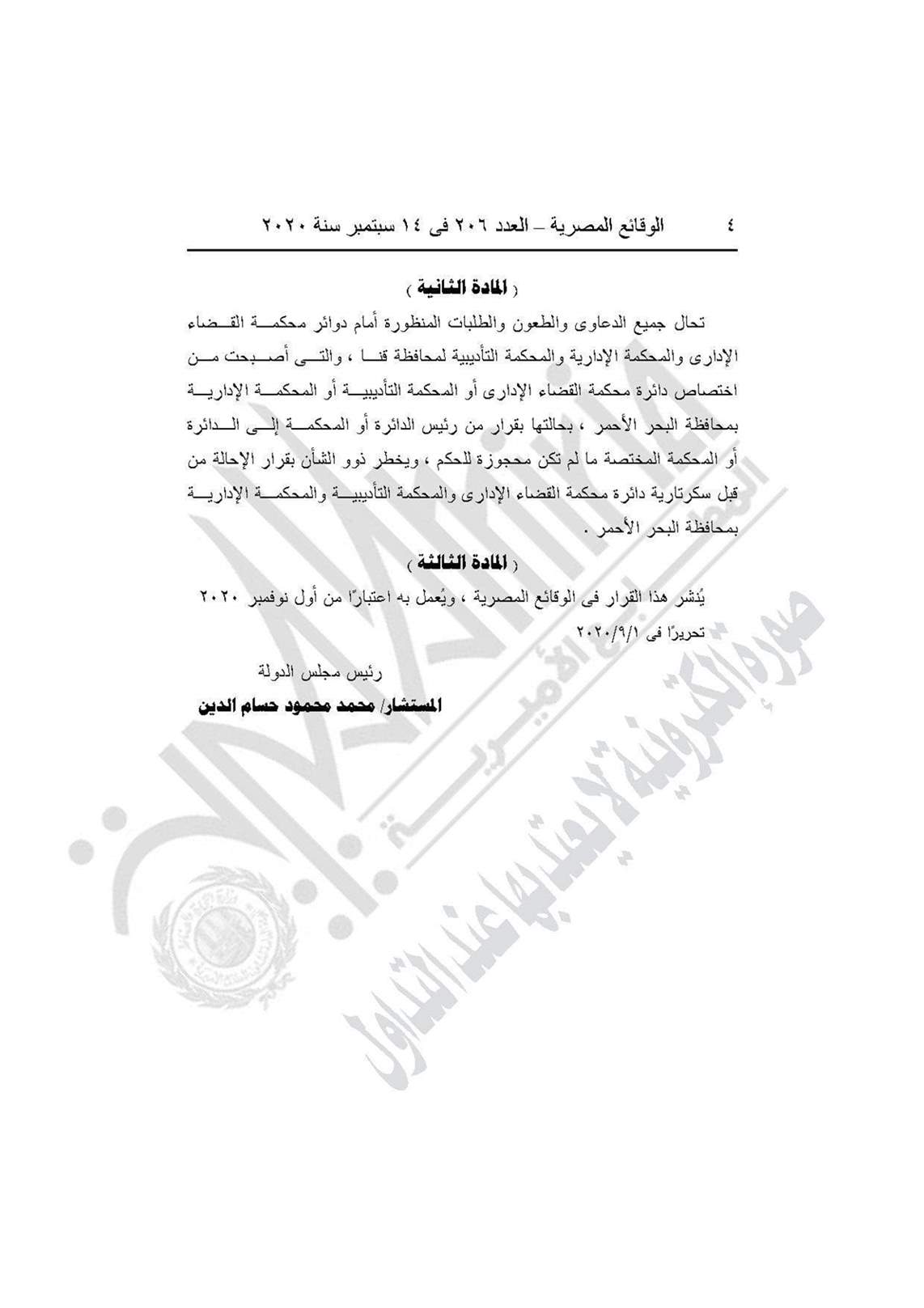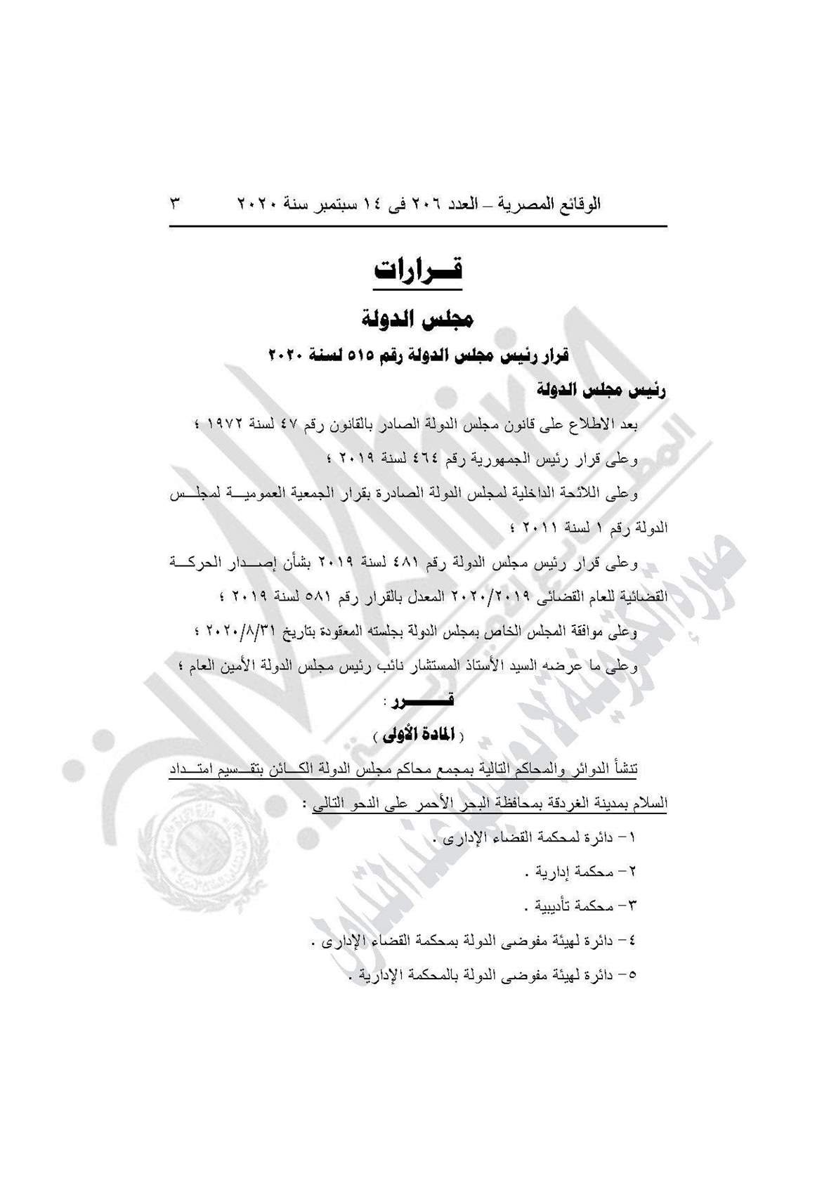نشرت جريدة الوقائع المصرية في عددها رقم 206، الصادر في 14 سبتمبر 2020، قرار رئيس مجلس الدولة رقم 515 لسنة 2020، بشأن إنشاء الدوائر (دائرة لمحكمة القضاء الإداري، ومحكمة إدارية، ومحكمة تأديبية، ودائرة لهيئة مفوضي الدولة بمحكمة القضاء الإداري، ودائرة لهيئة مفوضى الدولة بالمحكمة الإدارية) بمجمع محاكم مجلس الدولة بالغردقة.
