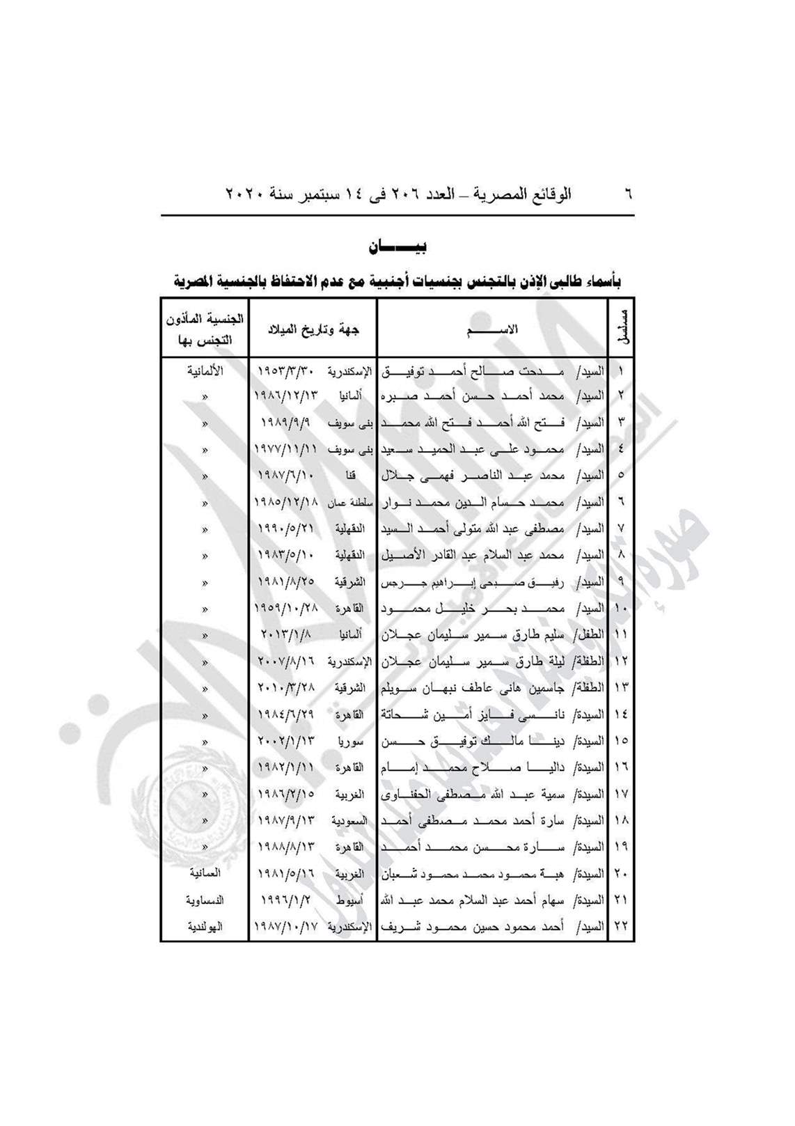 - القرار رقم 1206 لسنة 2020، بالأذن لكل من 22 مواطنًا (أولهم عثمان يونس أحمد عثمان، وآخرهم وليد أحمد عبد الرحمن حسن)، المدرجة أسماؤهم بالبيان التجنس بالجنسية الأجنبية قرين اسم كل منهم، مع احتفاظهم بالجنسية المصرية.