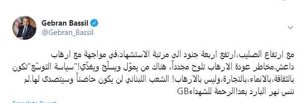 وكتب جبران باسيل تغريدة على تويتر "مع ارتفاع الصليب،ارتفع اربعة جنود الى مرتبة الاستشهاد،في مواجهة مع ارهاب داعش.مخاطر عودة الارهاب تلوح مجدداً، هناك من يموّل ويسلّح ويغذّي!"سياسة التوسّع"تكون بالثقافة، بالانماء، بالتجارة، وليس بالارهاب! الشعب اللبناني لن يكون حاضناً وسيتصدى لها. لم ننس نهر البارد بعد!الرحمة للشهداءGB"