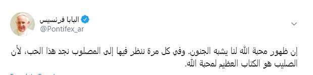وكتب البابا فرنسيس تغريدة على تويتر قال فيها: "إن ظهور محبة الله لنا يشبه الجنون. وفي كل مرة ننظر فيها إلى المصلوب نجد هذا الحب، لأن الصليب هو الكتاب العظيم لمحبة الله".