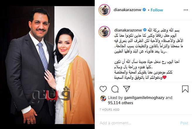 ونشرت ديانا صورتها مع خطيبها مؤكدة أنها كانت تتمنى وجود الأهل والأصدقاء ولكن الظروف منعت ذلك، معلقة "بسم الله وعلى بركة الله اليوم حفل زفافنا