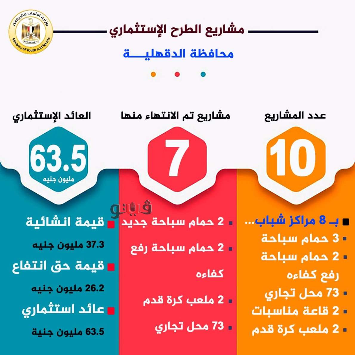 أعلنت مديرية الشباب والرياضة بمحافظة الدقهلية الانتهاء من تنفيذ 7 مشروعات استثمارية بنظام حق الانتفاع ( BOT ) بعدد من مراكز الشباب بمحافظة الدقهلية وجاري الانتهاء من ٣ مشروعات بتكلفة انشائية قدرها 37.3 مليون جنيـه .