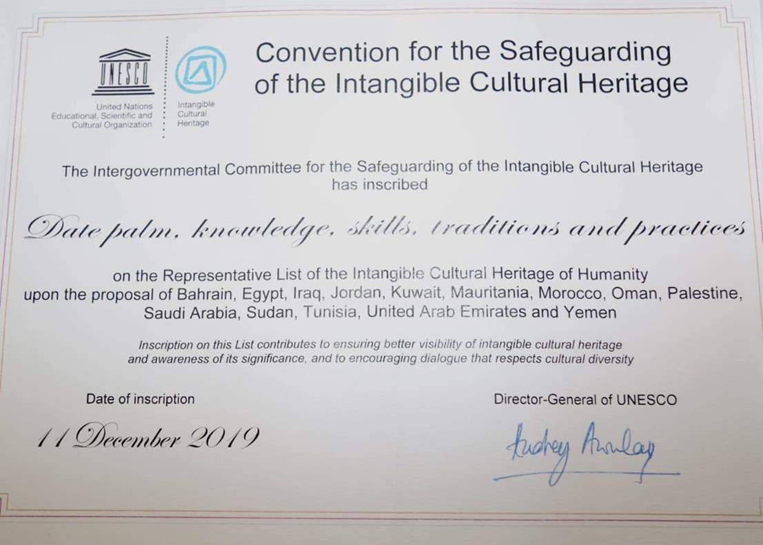وزيرة الثقافة تتسلم شهادة تسجيل «النخلة» بالقائمة التمثيلية للتراث الإنساني