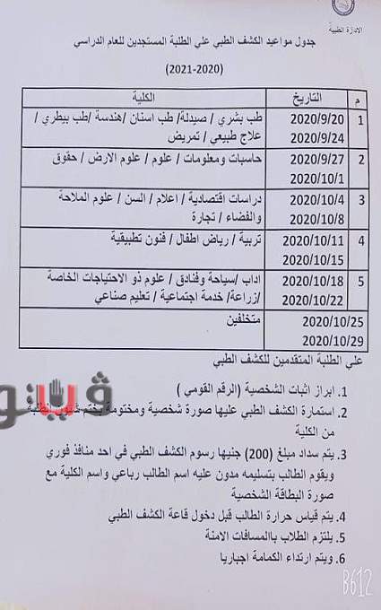 وعلى الطلاب المتقدمين للكشف الطبي إبراز إثبات الشخصية أو شهادة الميلاد المميكنة، بالإضافة لصورة من استمارة النجاح بالثانوية العامة، فضلًا عن إستمارة الكشف الطبي والالتزام الإجباري بارتداء الكمامات والمسافات الآمنة بين الطلاب وقياس درجات الحرارة قبل دخول القاعة المخصصة للكشف الطبي.