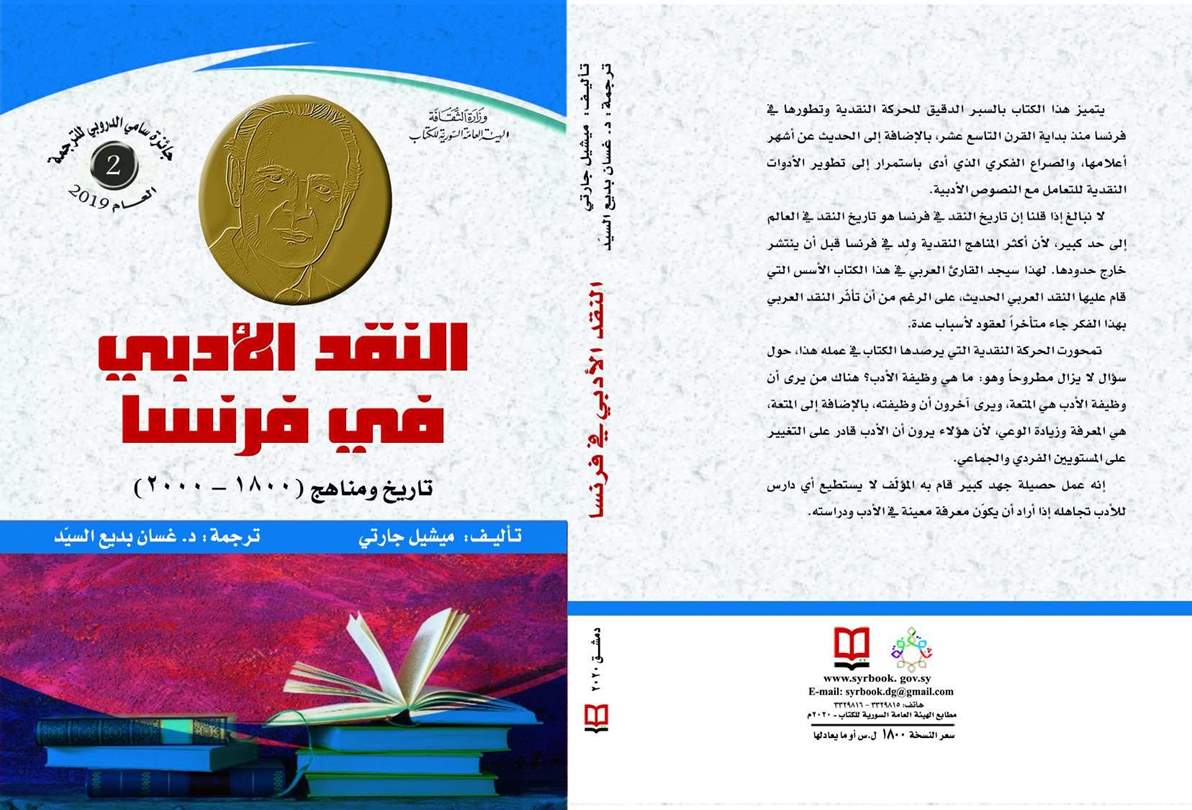 صدر حديثاً عن الهيئة العامة السورية للكتاب ، كتاب "النقد الأدبي في فرنسا... تاريخ ومناهج "1800 - 2000""الفائز بـ جائزة سامي الدروبي للترجمة العام الماضي، تأليف ميشيل جارتي، ترجمة وتقديم الدكتور غسان بديع السيد، وصمم الغلاف عبد العزيز محمد.