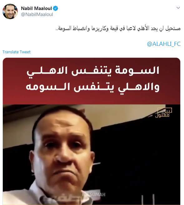 وكتب نبيل معلول تغريدة على "تويتر": "مستحيل ان يجد الأهلي لاعبا في قيمة وكاريزما وانضباط السومة.."..