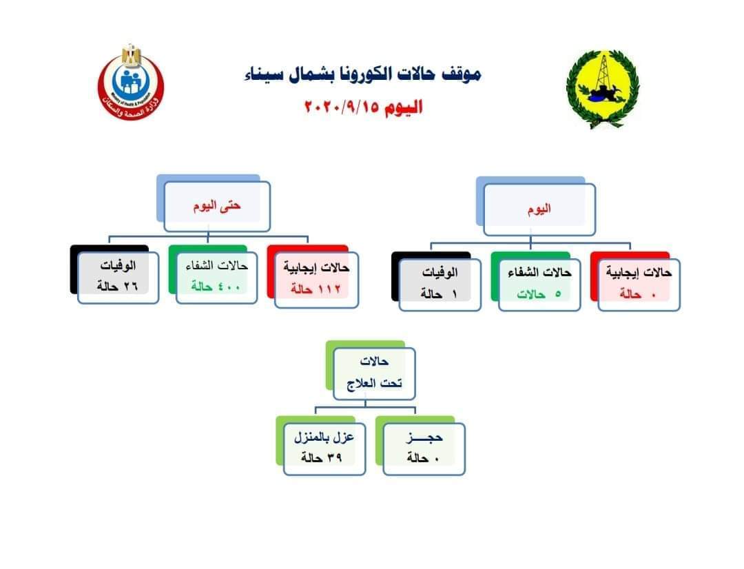 واضافت المديرية ان المحافظة لم تسجل اليوم اى حالات اصابة بفيروس كورونا مشيراً إلى أن نقطة الفحص الطبي بكمين الميدان تواصل مهام عملها لفحص المسافرين الوافدين لمدينة العريش من فيروس كورونا المستجد.