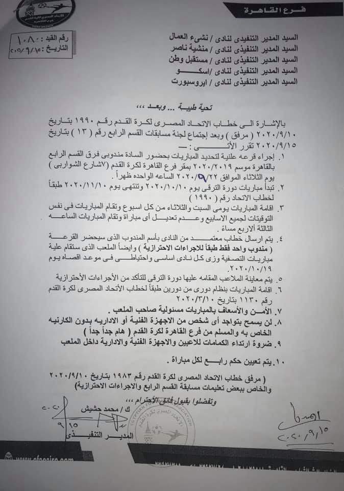 وأكدت المنطقة في خطاب مرسل للفرق المتأهلة لدورة الترقي مختوم من محمد حشيش المدير التنفيذي للمنطقة وأيمن حسان مدير إدارة المسابقات ، إقامة المباريات أيام السبت والثلاثاء من كل إسبوع وفي نفس الموعد في الثالثة الا ربع عصرا.