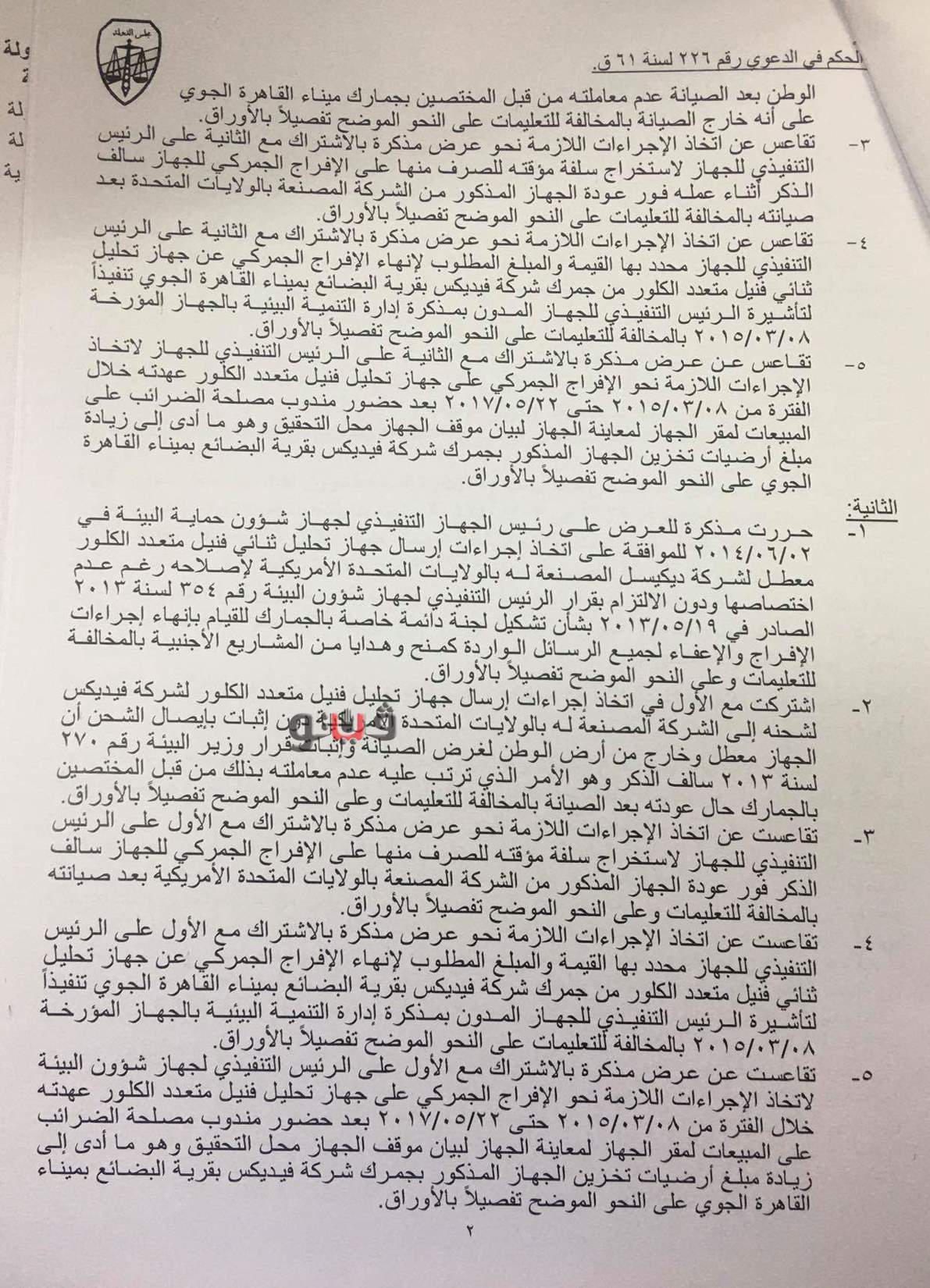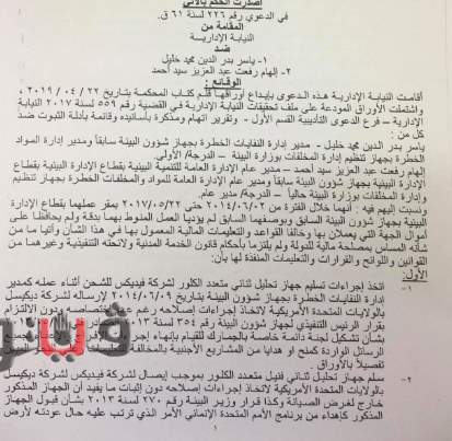 وقضت المحكمة بخصم أجر شهر من راتب ياسر بدر الدين محمد، مدير إدارة المواد الخطرة بوزارة البيئة، ومجازاة الهام رفعت عبد العزيز، مدير عام إدارة المواد والمخلفات الخطرة بوزارة البيئة بعقوبة التنبيه لقيامهما باتخاذ إجراءات تسليم جهاز تحليل ثنائي متعدد الكلور لشركة فيديكس للشحن لإرساله إلى شركة فيديكس بالولايات المتحدة الأمريكية لاتخاذ إجراءات إصلاحه