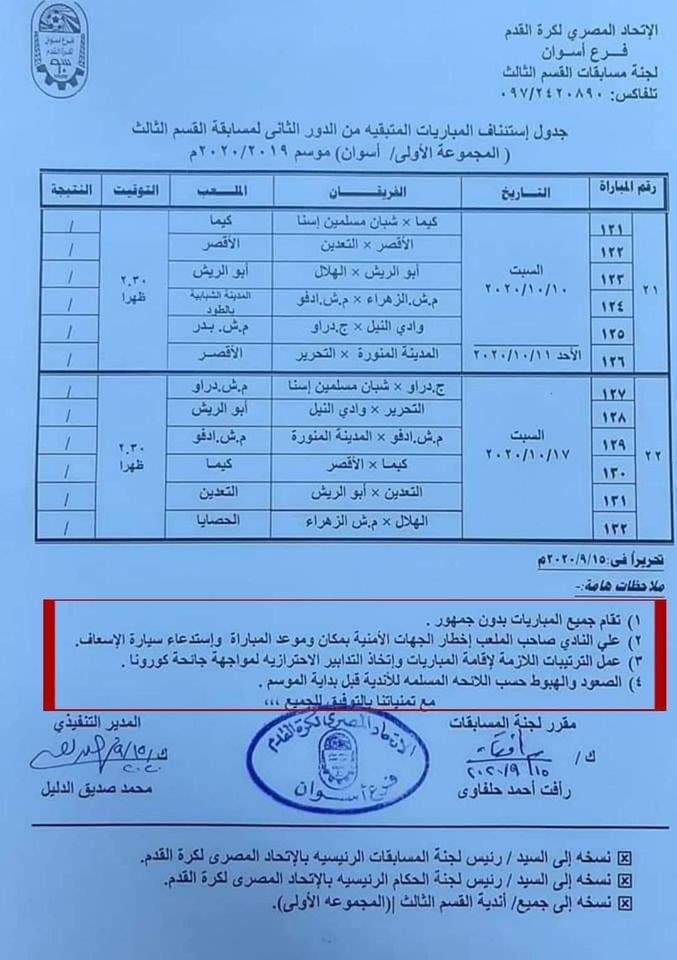 ونفس الأمر أعلنت منطقة أسوان لكرة القدم جدول إستكمال مباريات المجموعة الأولي والتي تنظمها المنطقة.
