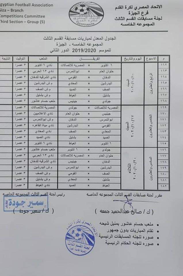 كما أعلنت منطقة الجيزة لكرة القدم المنظمة للمجموعة الخامسة لدوري القسم الثالث جدول إستكمال البطولة.