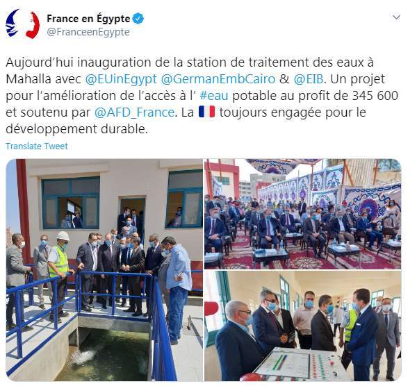 وكتبت السفارة الفرنسية بالقاهرة تغريدة على تويتر: "افتتاح اليوم محطة معالجة المياه بالمحلة بالدلتا بحضور رئيس وفد الاتحاد الأوروبي في مصر وسفير فرنسا وسفير ألمانيا في مصر".