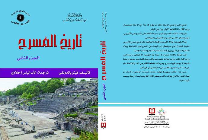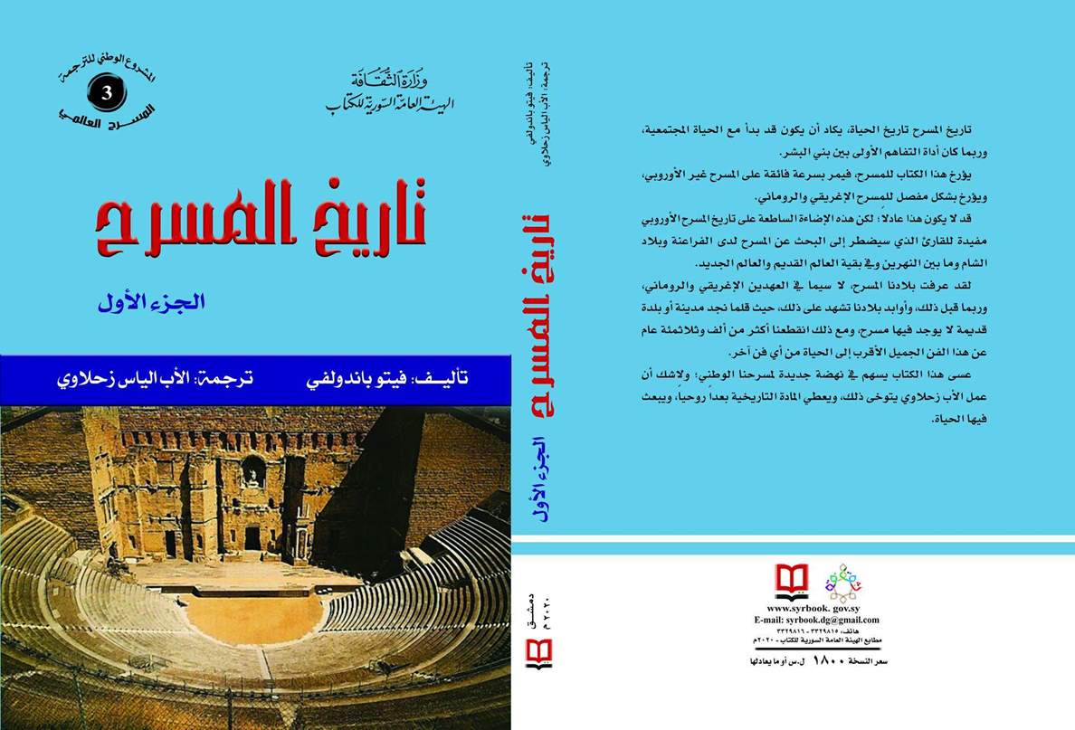 صدر حديثاً عن الهيئة العامة السورية للكتاب ، وضمن "المشروع الوطني للترجمة" كتاب "تاريخ المسرح" بجزأيه الأول والثاني ، تأليف: فيتو باندولفي، ترجمة الأب إلياس زحلاوي، وصمم الغلاف عبد العزيز محمد.