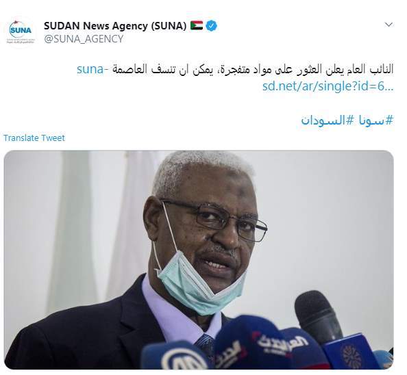 أكدت وكالة الأنباء السودانية (سونا) عثور الشرطة السودانية على مواد متفجرة يمكن أن تفجر العاصمة السودانية الخرطوم، وجاء في إعلان النائب العام السوداني مولانا تاج السر الحبر، في تصريح صحفي، أنه عثر على مواد متفجرة الآن بحضور المدير العام للشرطة ونائب رئيس الدعم السريع والناطق الرسمي للدعم السريع، وهذه المواد تشكل خطرًا أمنيًا على السودان والدول المجاورة.