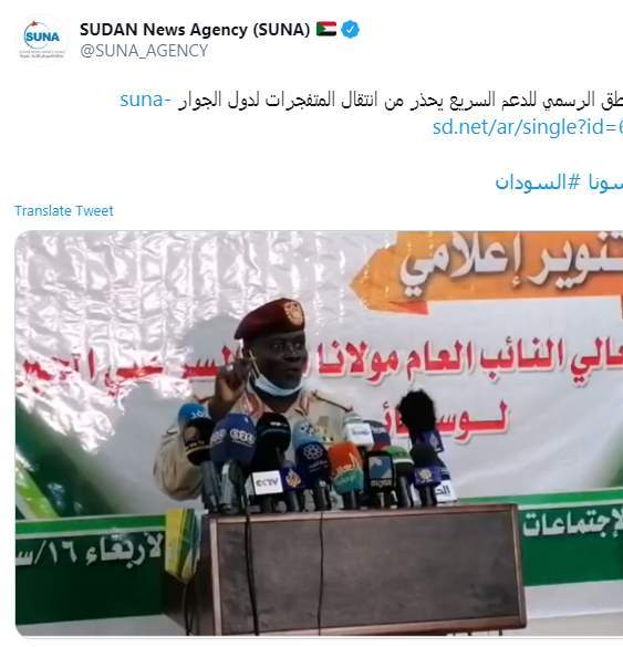 كما حذر العميد جمال جمعة آدم، الناطق الرسمي باسم قوات الدعم السريع، من انتقال كميات كبيرة من المتفجرات لدول الجوار، قائلا: "نخشى أن نصنف مرة أخرى من الدول الراعية للإرهاب"، منبهًا أن ماحدث يعد مؤشرًا خطيرًا في نفسية المواطن السوداني.