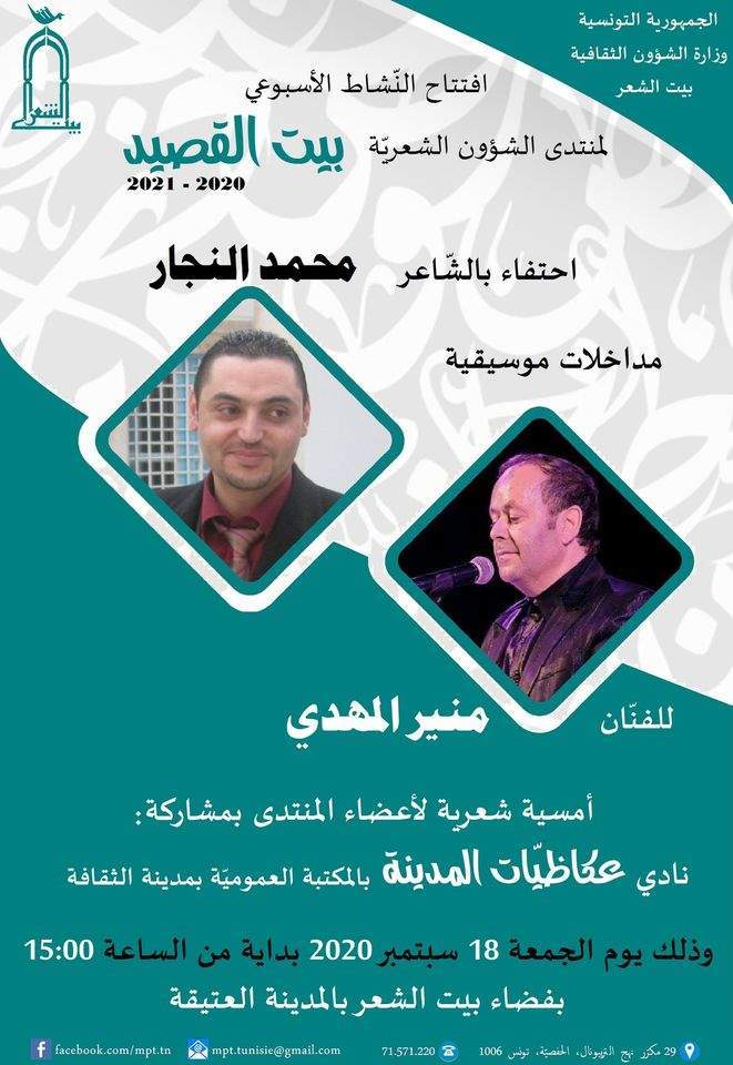 ويتضمن برنامج المنتدي أمسية شعرية احتفاء بالشاعر محمد النجّار ، يليه عرض موسيقي للفنان منير المهدي ، وقراءات شعريّة مشتركة: بين أعضاء منتدى بيت القصيد ببيت الشعر التونسي ونادي "عكاظيّات المدينة" التابع للمكتبة العمومية بمدينة الثقافة.