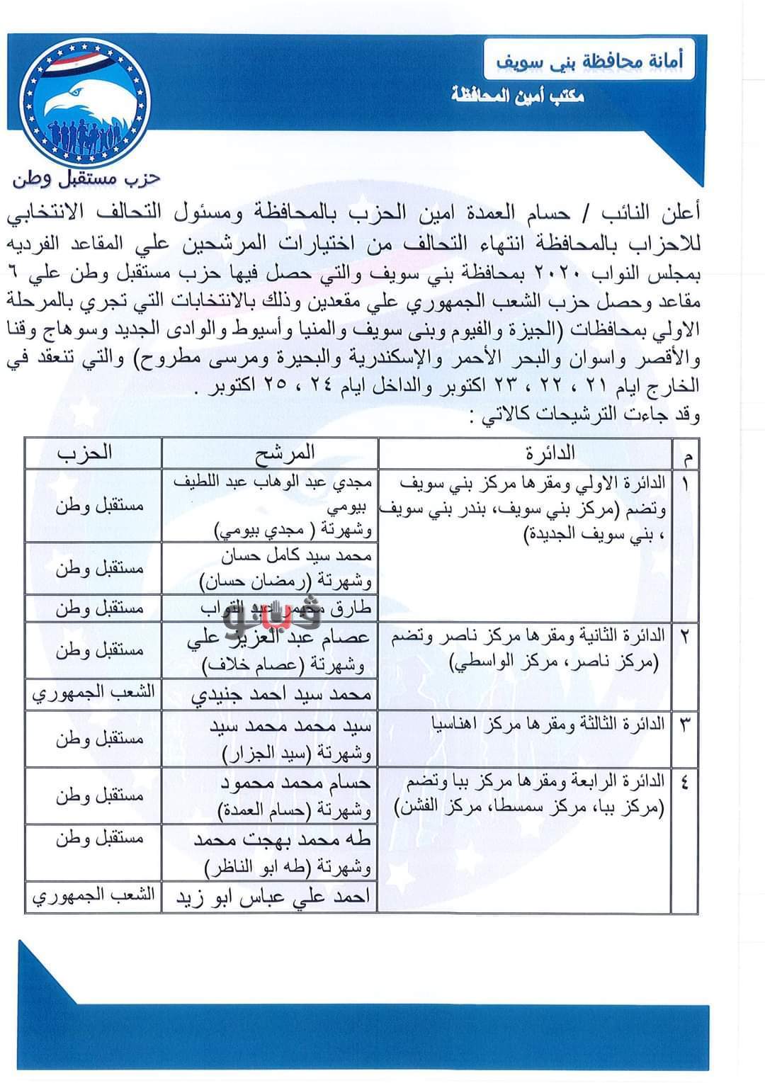 وجاءت الأسماء كالتالي في الدائرة الأولى ومقرها مركز وبندر بنى سويف "مجدي عبد الوهاب عبد اللطيف، وشهرته مجدي بيومي، و محمد سيد كامل وشهرته رمضان حسان، و طارق مخيمر عبد التواب" مرشحون عن حزب مستقبل وطن.