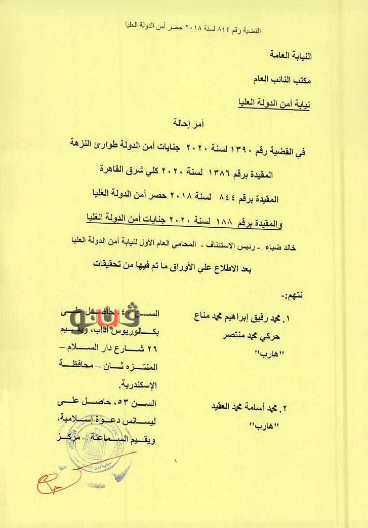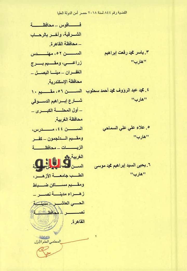 رئيس الاستئناف والمحامى العام الأول لنيابات أمن الدولة العليا، قيام المتهمين وهم: محمد رفيق إبراهيم محمد مناع "حركى محمد منتصر" هارب 40 سنة، محمد أسامة محمد العقيد السن 53 سنة هارب، ياسر محمد رفعت إبراهيم هارب 52 سنة، محمد عبد الرءوف محمد سحلوب "هارب"، علاء على السماحى 44 سنة "هارب"، يحيى السيد إبراهيم محمد موسى 46 سنة "هارب"، أحمد محمد عبد الرحمن 60 سنة هارب، على عبد الفتاح على عبد الفتاح 62 سنة، محمد السيد محمد