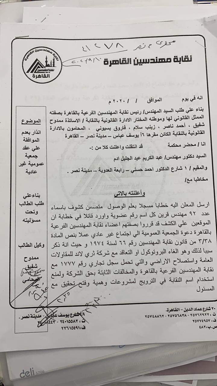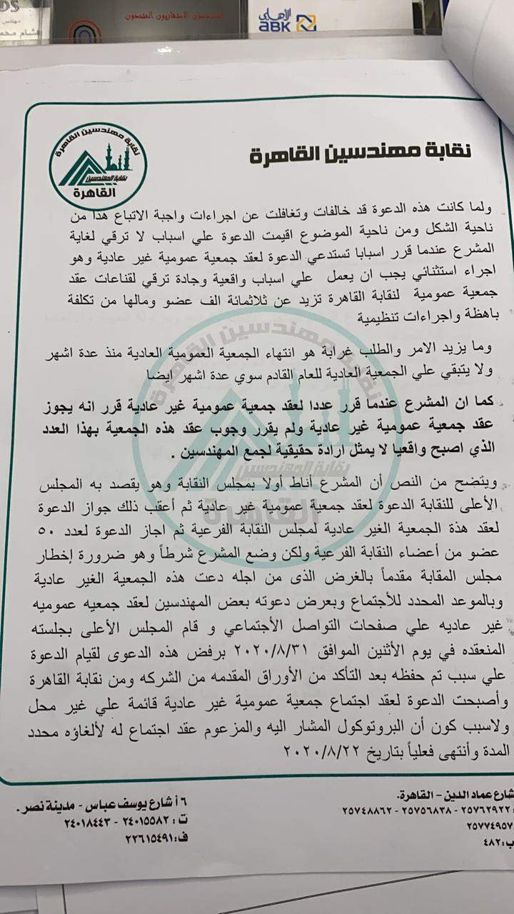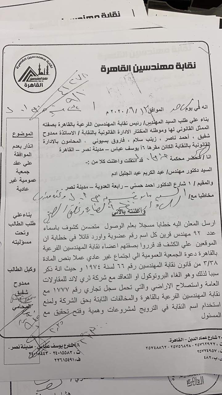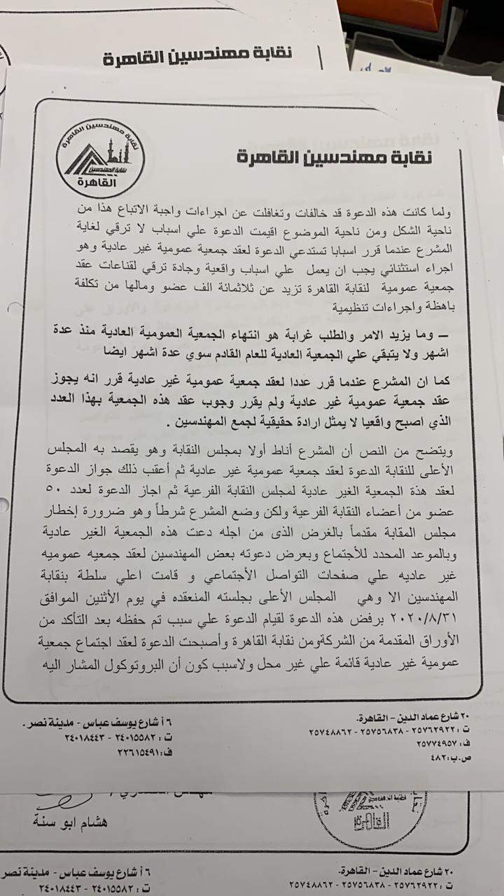 قال المهندس هشام أبو سنة نقيب مهندسي القاهرة، إن الدعوة لعقد الجمعية العمومية والخاصة بقيام نقابة المهندسين الفرعية بالقاهرة بالإعلان على صفحتها الرسمية على فيسبوك لإحدى شركات استصلاح الأراضى، تم مناقشته خلال اجتماع المجلس الأعلى لنقابة المهندسين المنعقد بتاريخ 31 / 8 /٢٠٢٠.