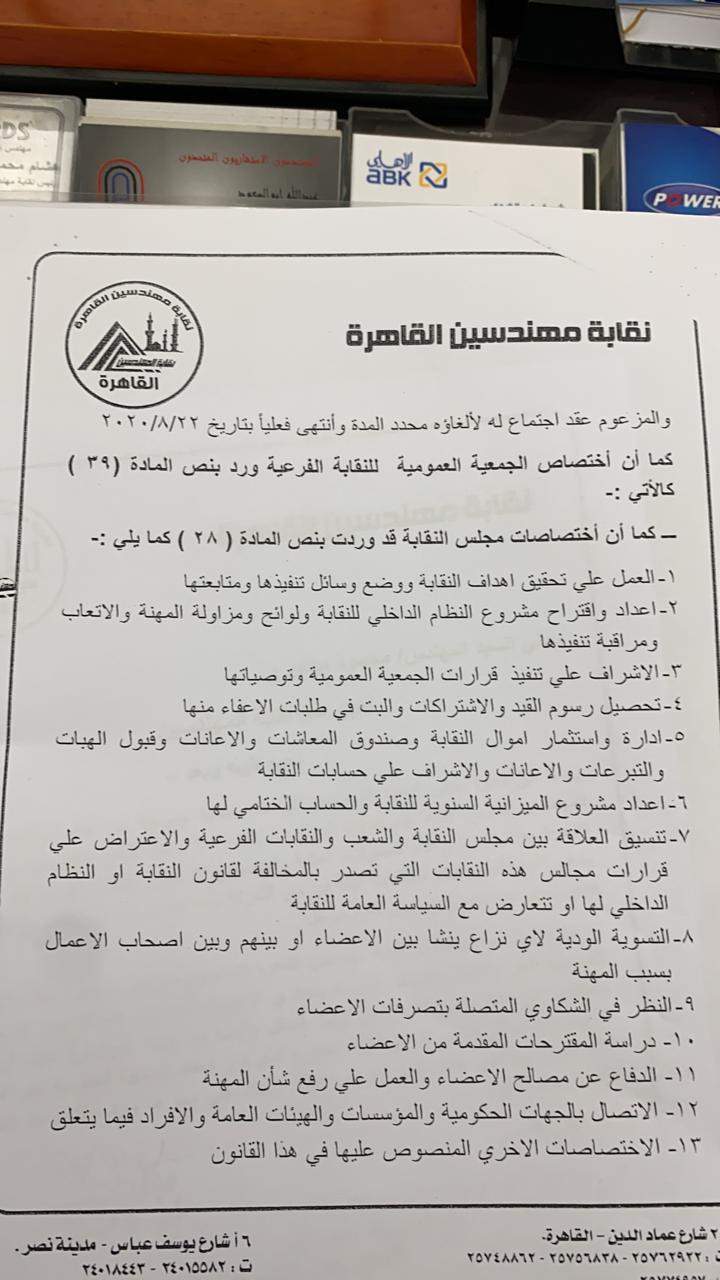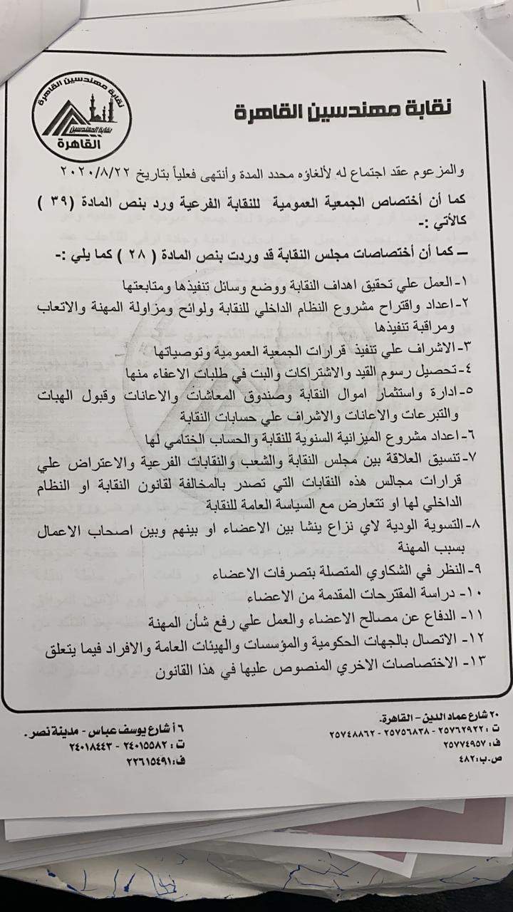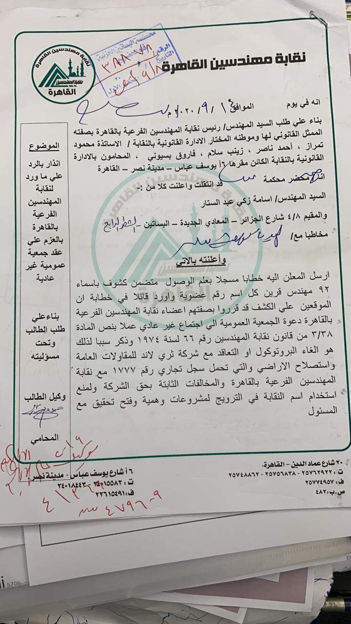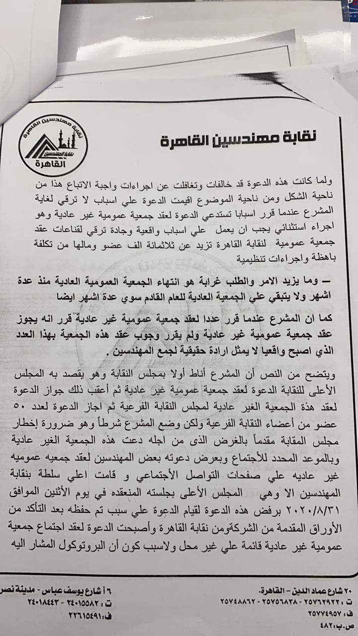 قال المهندس هشام أبو سنة نقيب مهندسي القاهرة، إن الدعوة لعقد الجمعية العمومية والخاصة بقيام نقابة المهندسين الفرعية بالقاهرة بالإعلان على صفحتها الرسمية على فيسبوك لإحدى شركات استصلاح الأراضى، تم مناقشته خلال اجتماع المجلس الأعلى لنقابة المهندسين المنعقد بتاريخ 31 / 8 /٢٠٢٠.