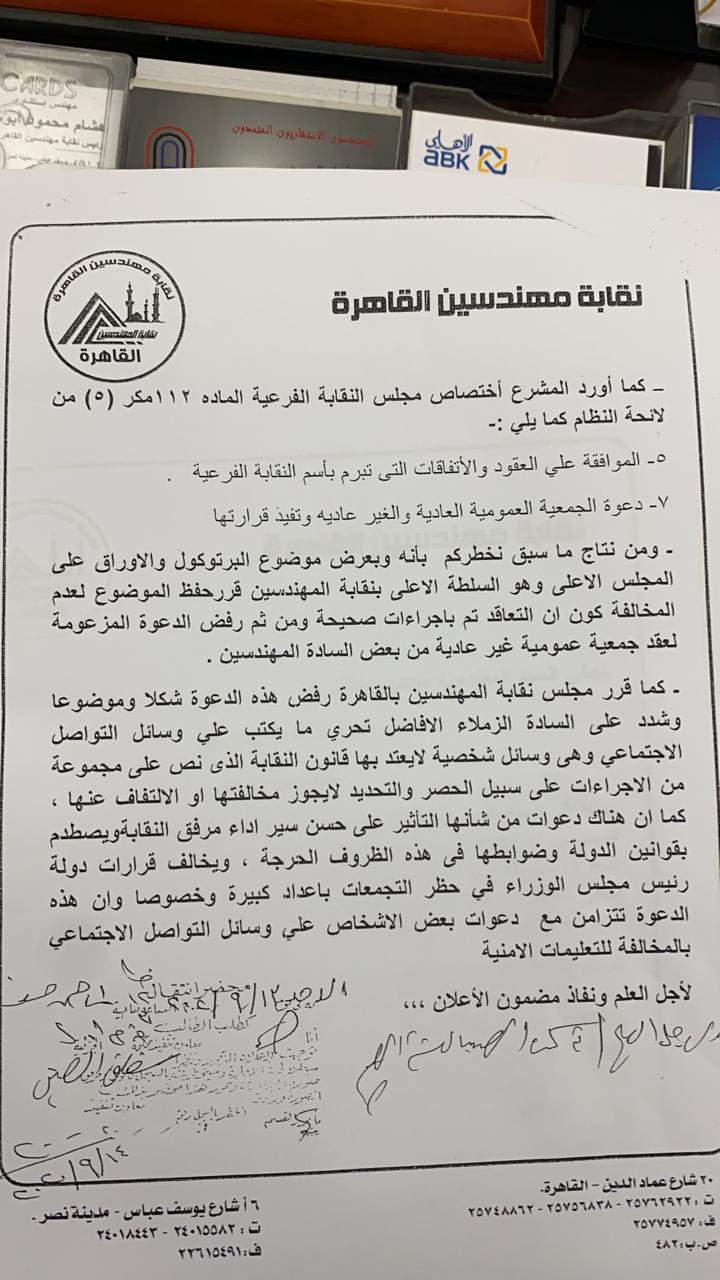 وتدعو نقابة مهندسى القاهرة أعضائها الكرام بتحرى الحقيقة من مصادرها بدلًا من الكلام على صفحات شخصية عبر مواقع التواصل الاجتماعى، وذلك بالاطلاع على أي إجراء تم وأى تعاقد تم إبرامه، مناشدة أعضاء الجمعية العمومية بضرورة تحرى الدقة عن ما يثار بمواقع التواصل الاجتماعى من دعوات هدفها إثارة الرأى العام والدعوة إلى عمل تجمعات تخالف قوانين الدولة، والتعليمات والإجراءات الواجب اتباعها فى هذه الظروف، واستغلالها أعلاميا من بعض الجماعات والقنوات الإعلامية لأغراض ضد الدولة المصرية وزعزعة أمن البلاد، مما يثير الشكوك حول دعوة بعض المهندسين لموضوع تم الانتهاء من بحثه ومناقشته باجتماع المجلس الأعلى المشار إليه وتم حفظه.