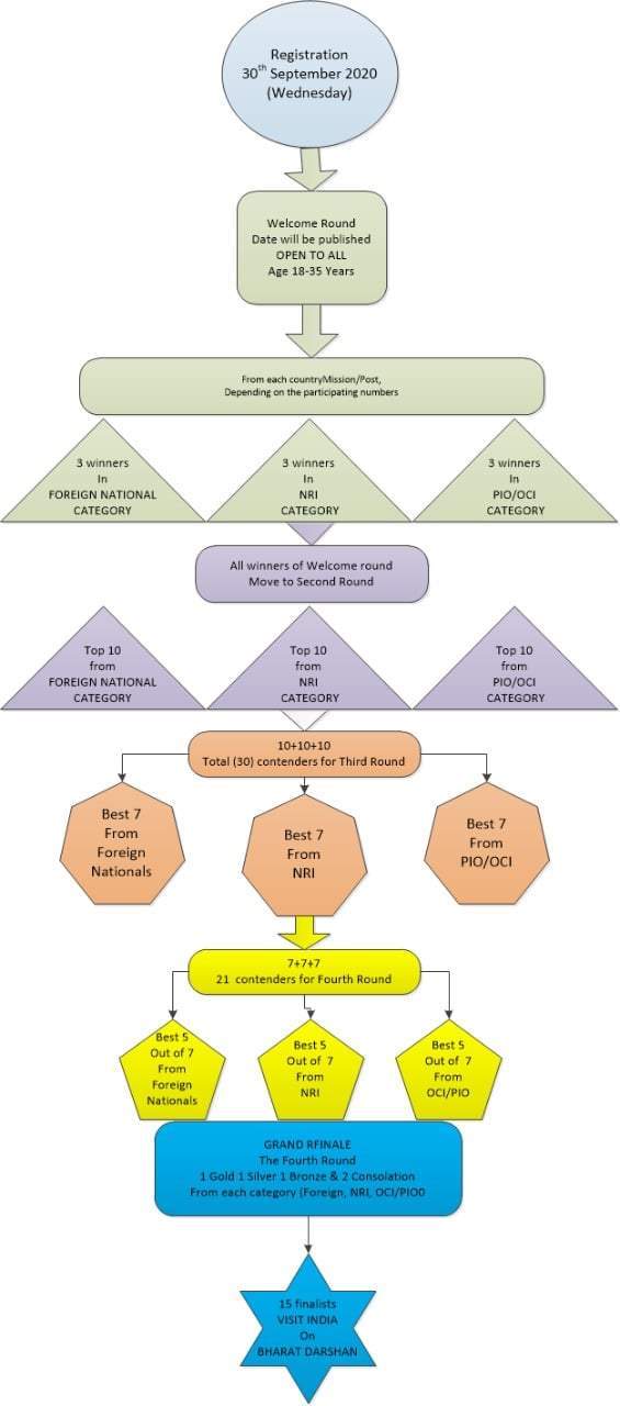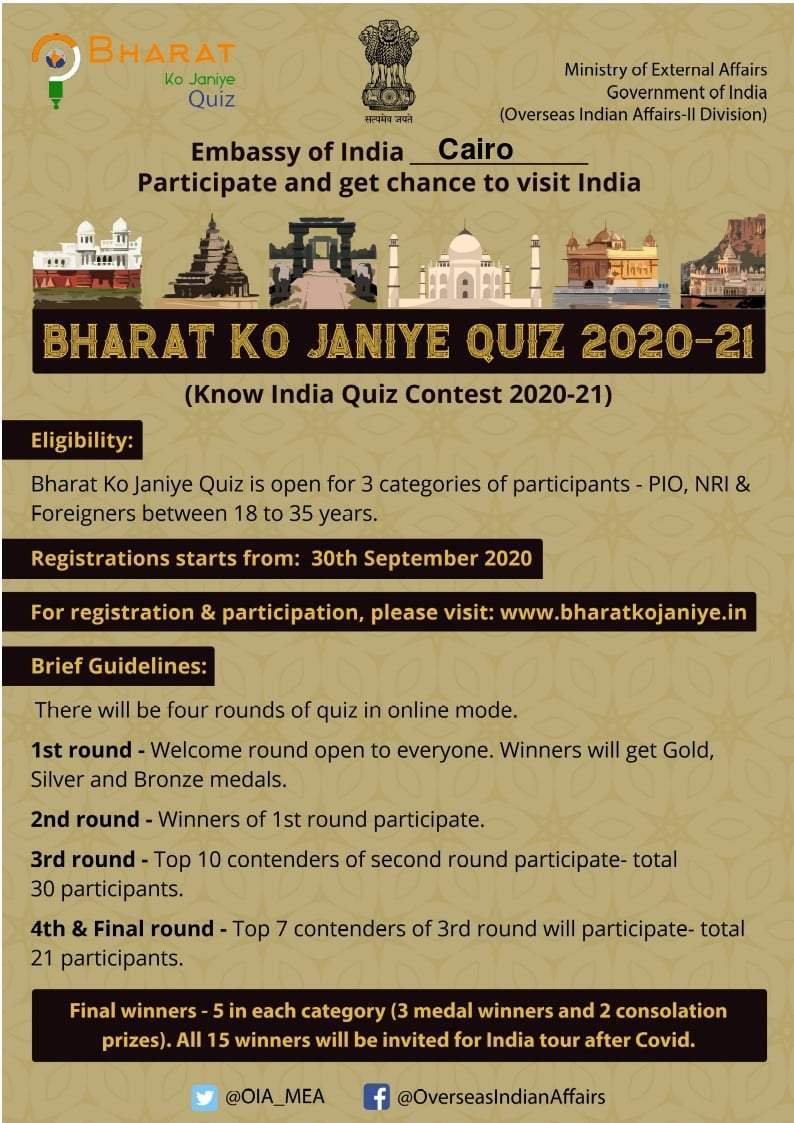 مسابقة "تعرف علي الهند" هي عبارة عن مبادرة من حكومة الهند، يتم فتح التسجيل فيها اعتبارًا من يوم الأربعاء الموافق 30 سبتمبر الجاري، للأشخاص ذوي الأصول الهندية والهنود غير المقيمين والمواطنين الأجانب، من الفئة العمرية مابين 18-35 عامًا.