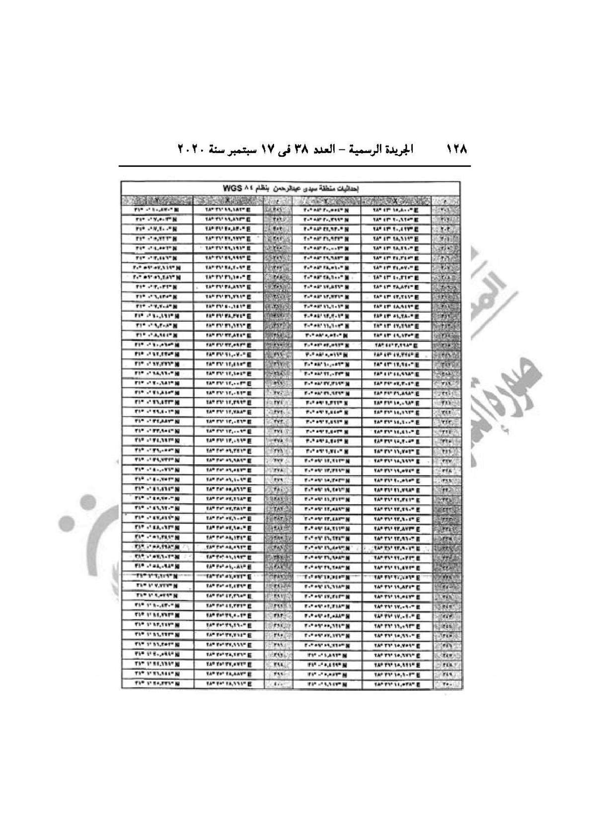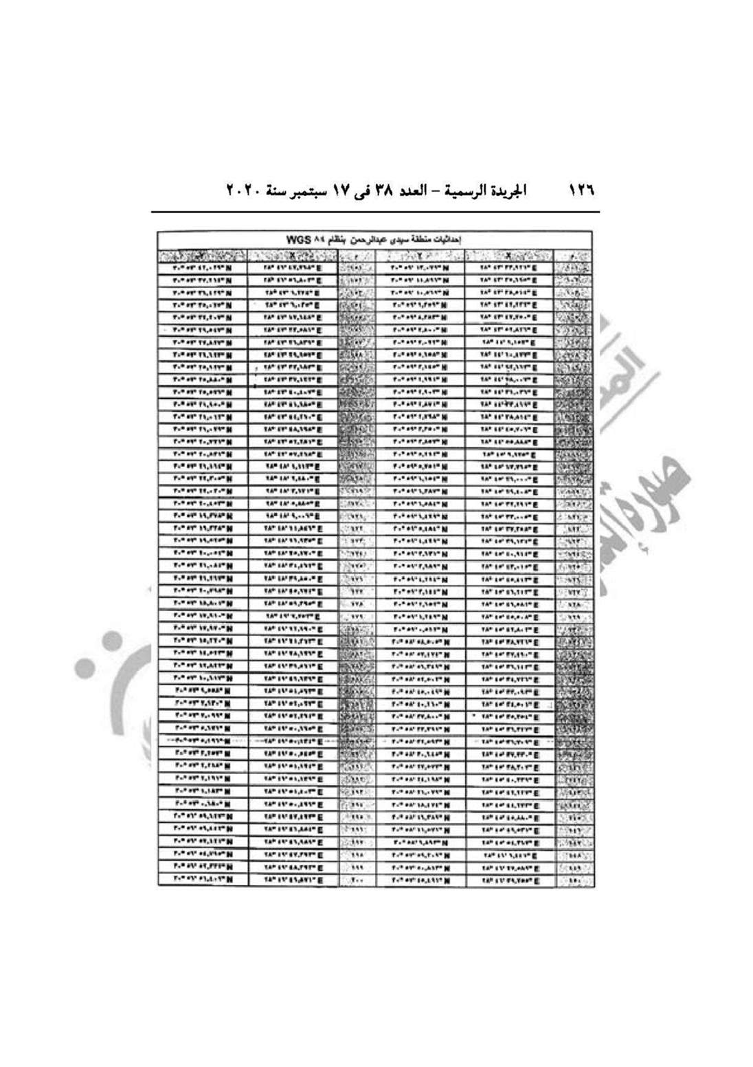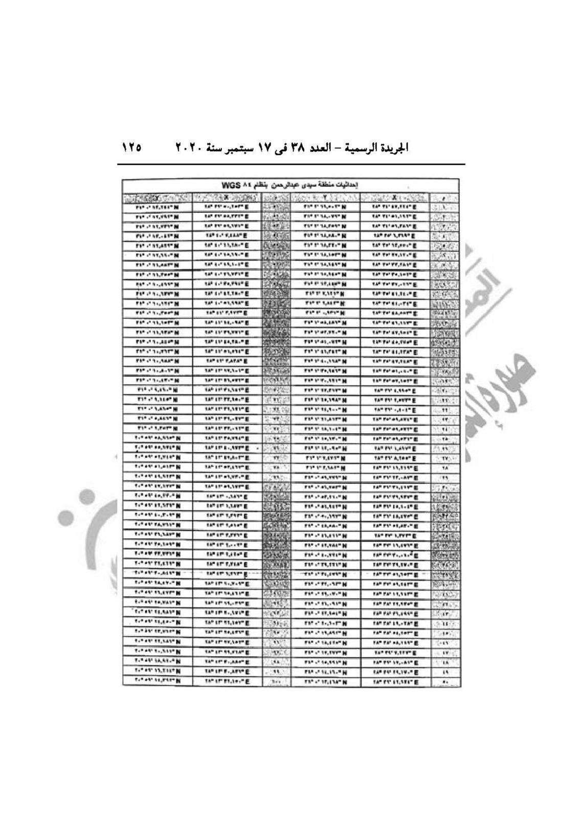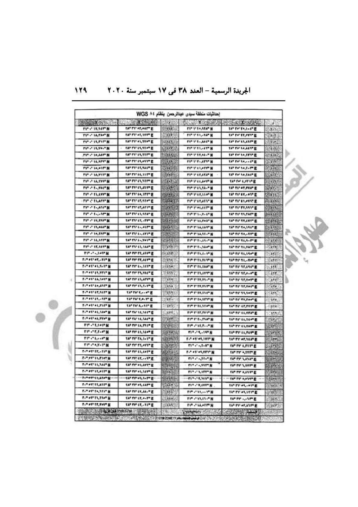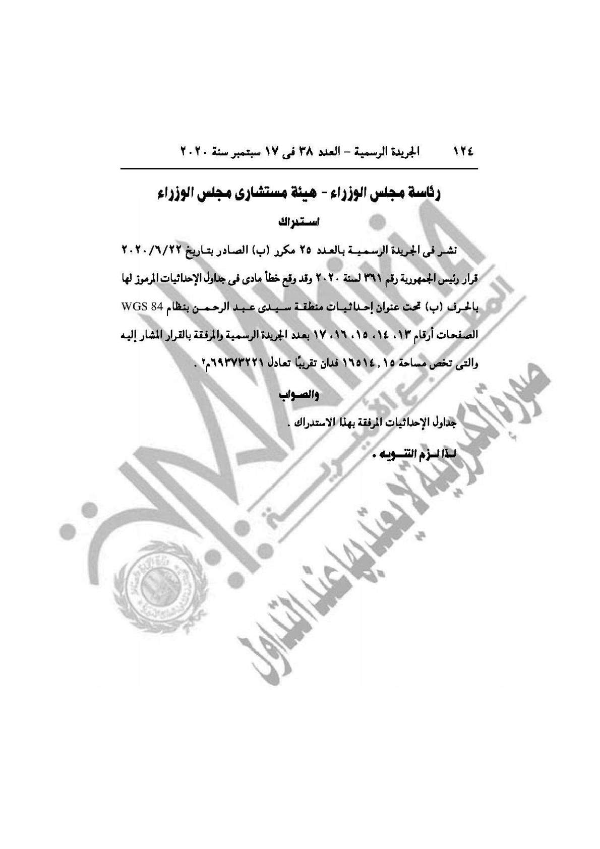 وجاء بالاستدراك أنه نشر في الجريدة الرسمية العدد 25 مكرر (ب) الصادر في 22/6/2020 قرار رئيس الجمهورية رقم 361 لسنة 2020، وقع خطأ مادي في جداول الإحداثيات المرموز لها بالحرف (ب) تحت إحداثيات عنوان إحداثيات منطقة سيدي عبد الرحمن بنظام WGS 84 والتصويب جداول الاحداثيات بهذا الاستدراك.
