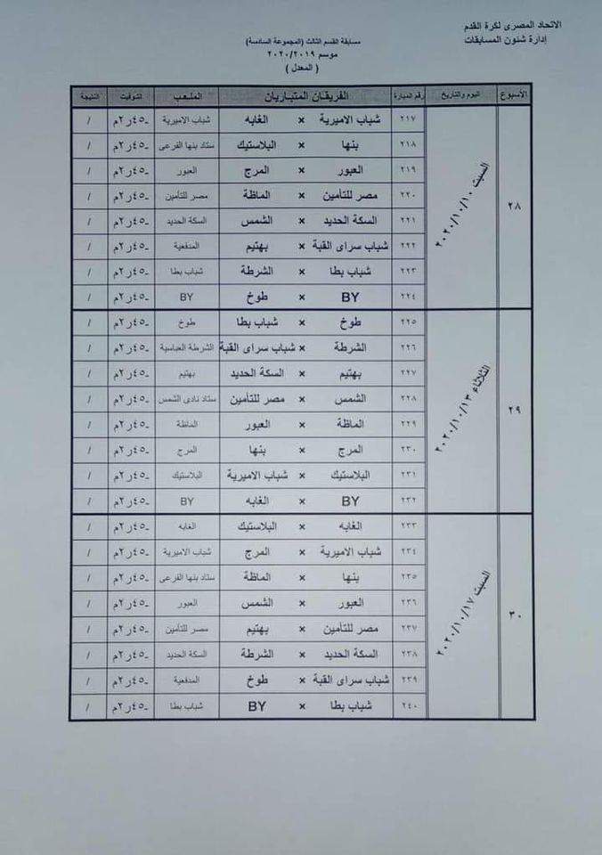 أعلنت منطقة القاهرة لكرة القدم، برئاسة حمادة الشربيني، جدول الأسابيع المتبقية لدوري القسم الثالث للمجموعة السادسة التي تنظمها المنطقة في الموسم الجاري بمشاركة 15 فريقا من فرعي القاهرة والقليوبية بعد الجولة الـ 27.