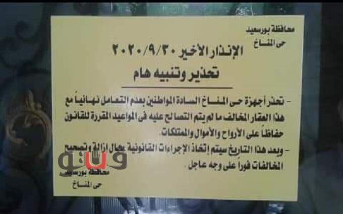 وكانت قد قامت لجنة مشكلة من حي المناخ ببورسعيد بقيادة الدكتور منصور بكرى رئيس حى المناخ بالمرور بنطاق الحى ، ووضع ملصق تحذيرى على العقارات التى يوجد بها مخالفات بناء ولم يقم أصحابها بتقديم طلبات تصالح لها حتى الآن.