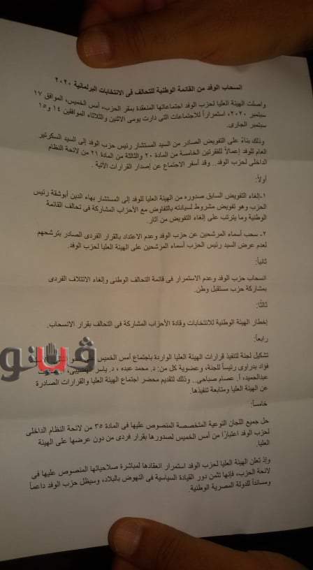 وأكد المستشار بهاء الدين أبو شقة، رئيس حزب الوفد، أن ما زُعم أنه عقد اجتماع للهيئة العليا للحزب اليوم، هو اجتماع على فرض حدوثه فهو والعدم سواء، لأنه فضلاً عن أنه صدر قرار من رئيس الحزب أمس بإلغاء هذا الاجتماع وهو حق أصيل له بمقتضى اللائحة اكتفاءاً بما أبلغه السكرتير العام أمس من أنه أجرى تصويتاً تليفونياً على من لم يصوت في الهيئة العليا المنعقدة بتاريخ 16/9 وانتهي التصويت على موافقة 25 عضواً على الاستمرار في القائمة الوطنية و15 عضواً بعدم الموافقة.
