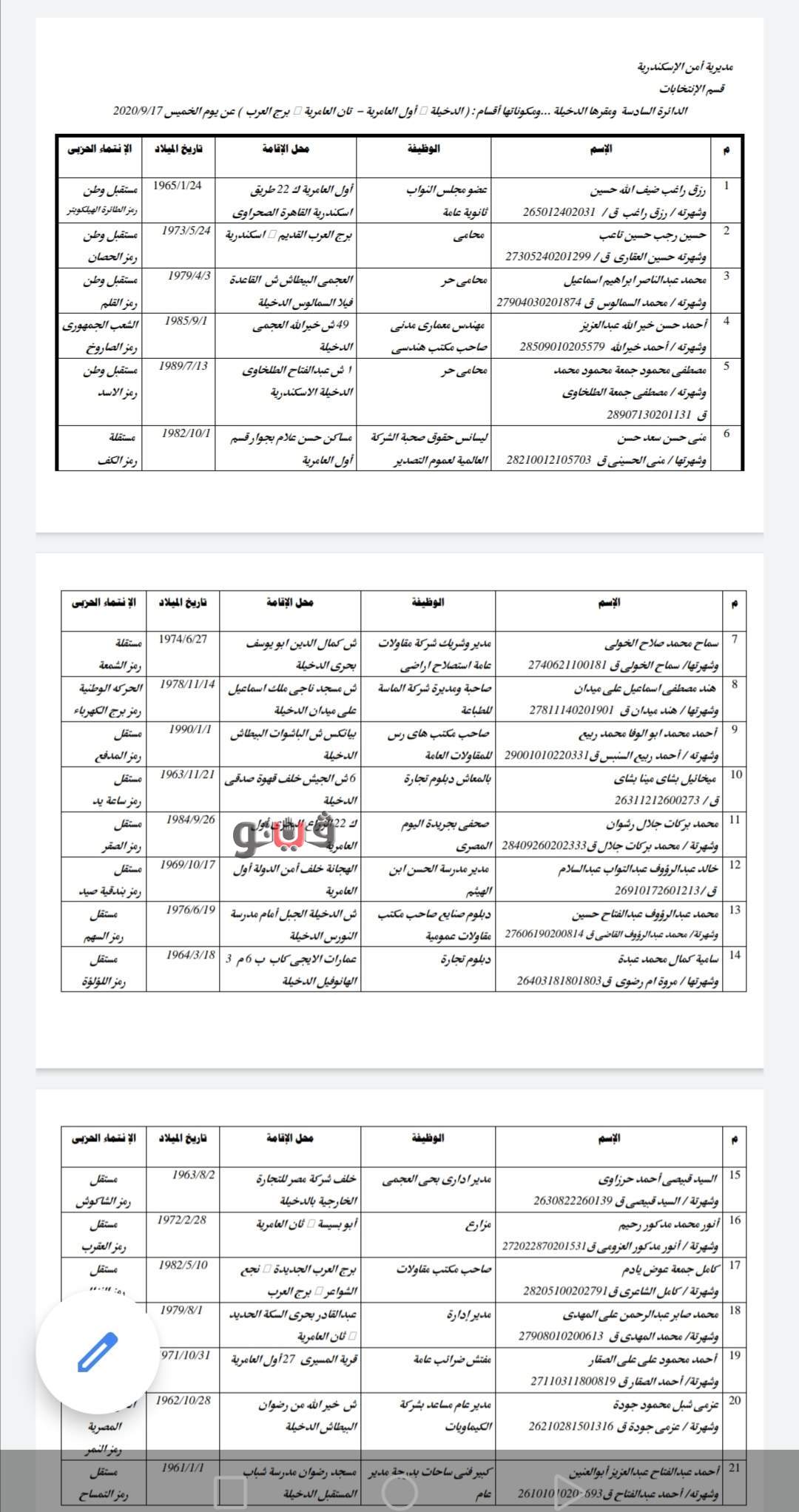 وجاءت السيدات اللاتي تقدمن بأوراق ترشحهن كالتالي، مني الحسيني محامية وصاحبه شركة من دائرة العامرية اول تخوض الانتخابات مستقله ، سماح الخولي مدير وشريك في شركة مقاولات من الدخيلة مستقل، هند ميدان صاحبه شركة طباعه وتخوض الانتخابات عن الحركة الوطنية ، من الدخيلة، سامية كمال دبلوم تجارة من مساكن الايجي كاب الهانوفيل مستقل.