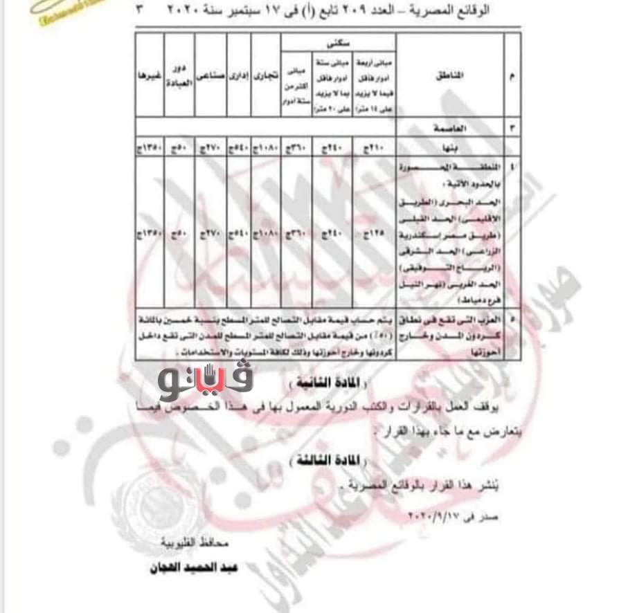 بالنسبة للعاصمة بنها فقد جرى تقسيمها كالآتي، سكنى: بالنسبة للمباني 4 أدوار فأقل فيما لا يزيد عن 14 مترًا أصبحت قيمة المتر بـ210 جنيهات، وبالنسبة للمباني 6 أدوار فأقل بما لا يزيد عن 20 مترًا أصبحت قيمة المتر بـ240 جنيهًا، وبالنسبة للمباني أكثر من 6 أدوار يصبح سعر المتر 360 جنيهًا، والتجاري أصبحت قيمة سعر المتر 1080 جنيهًا، والإداري بـ540 جنيهًا، وصناعي 270 جنيهًا، ودور العبادة بـ 50 جنيهًا، وغيرها بـ1350 جنيهًا.