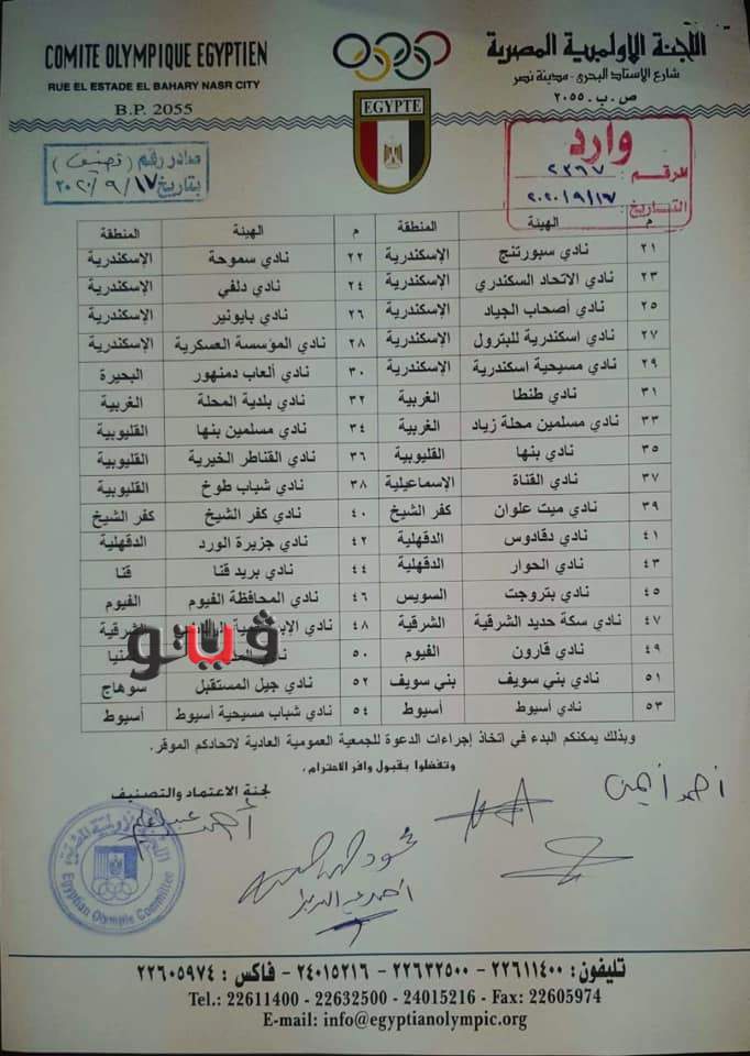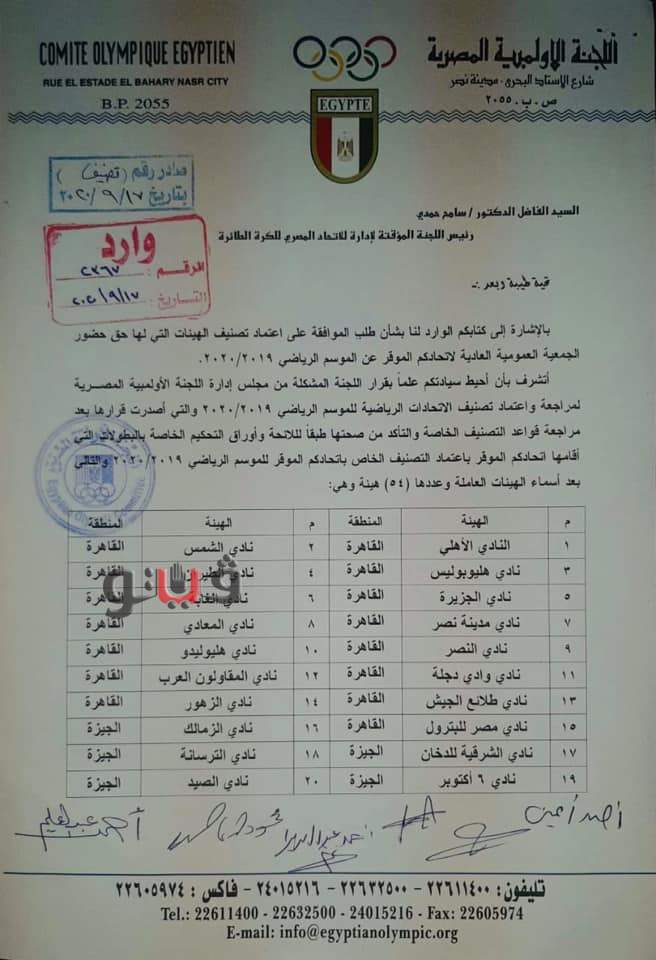 تلقى مسئولو اتحاد الكرة الطائرة برئاسة الدكتور سامح حمدي، خطابا من اللجنة الأولمبية، يتضمن قرار اعتماد الأندية التي لها حق الحضور والتصويت في الجمعية العمومية للاتحاد.