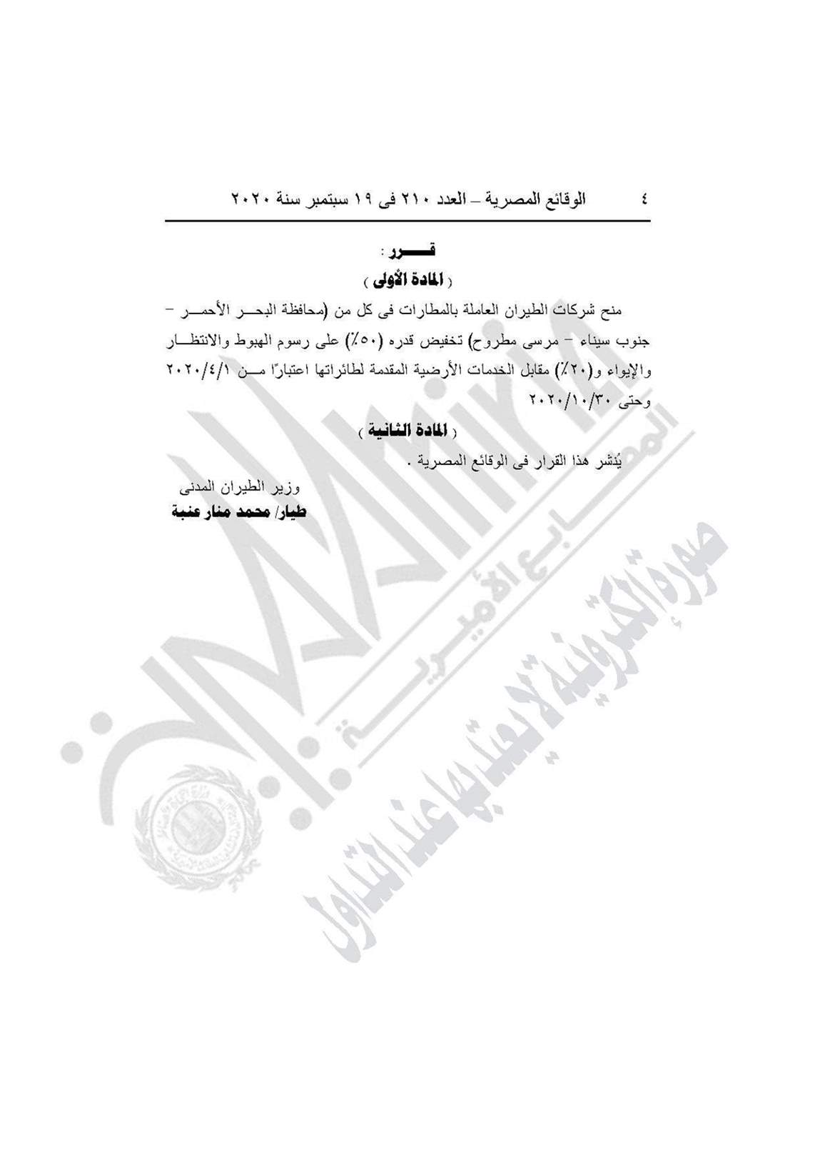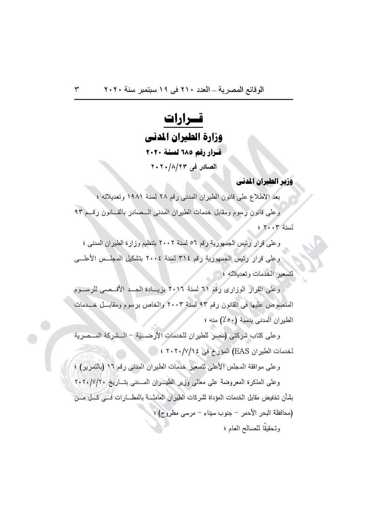 نشرت جريدة الوقائع المصرية في عددها رقم 210، الصادر في 19 سبتمبر 2020، قرار وزارة الطيران المدني رقم 685 لسنة 2020، بشأن منح شركات الطيران العاملة بالمطارات في كل من محافظة البحر الأحمر وجنوب سيناء ومرسى مطروح تخفيض 50% على رسوم الهبوط والانتظار، و20% مقابل الخدمات الأرضية.