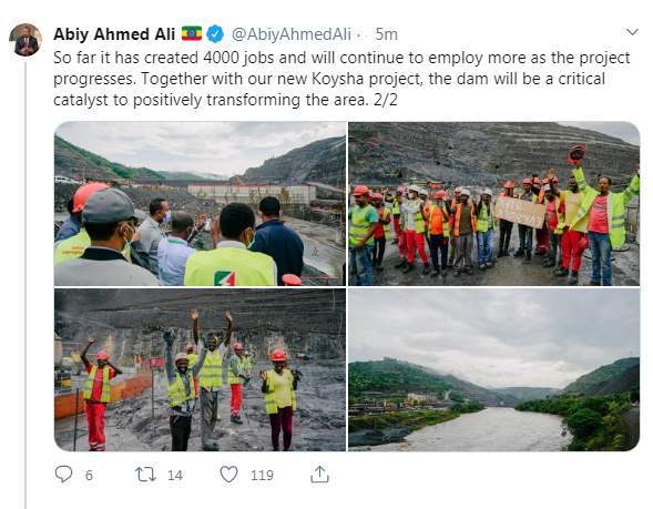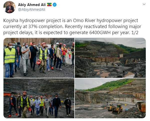وكتب رئيس الوزراء الأثيوبي أبي أحمد تغريدة على تويتر: "مشروع كويشا للطاقة الكهرومائية هو مشروع للطاقة الكهرومائية في نهر أومو وقد اكتمل حاليًا بنسبة 37٪.