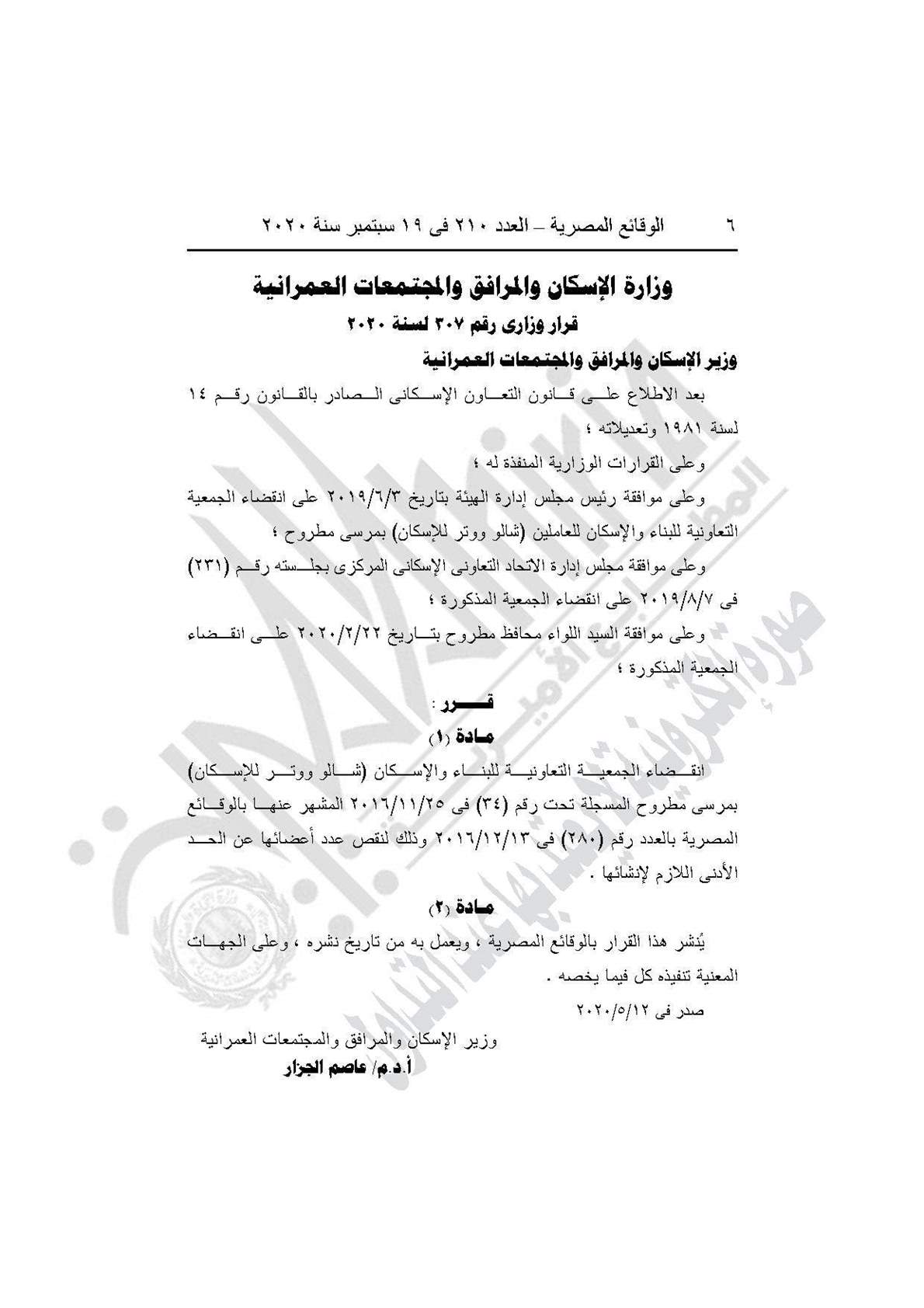 - القرار رقم 307 لسنة 2020، بشأن انقضاء الجمعية التعاونية للبناء والإسكان (شالو ووتر للإسكان" بمرسى مطروح المسجلة تحت رقم (34) في 25/11/2016، المشهر عنها بالوقائع المصرية بالعدد رقم 280 في 13/12/2016، وذلك لنقص عدد اعضائها عن الحد الأدنى اللازم لإنشائها.