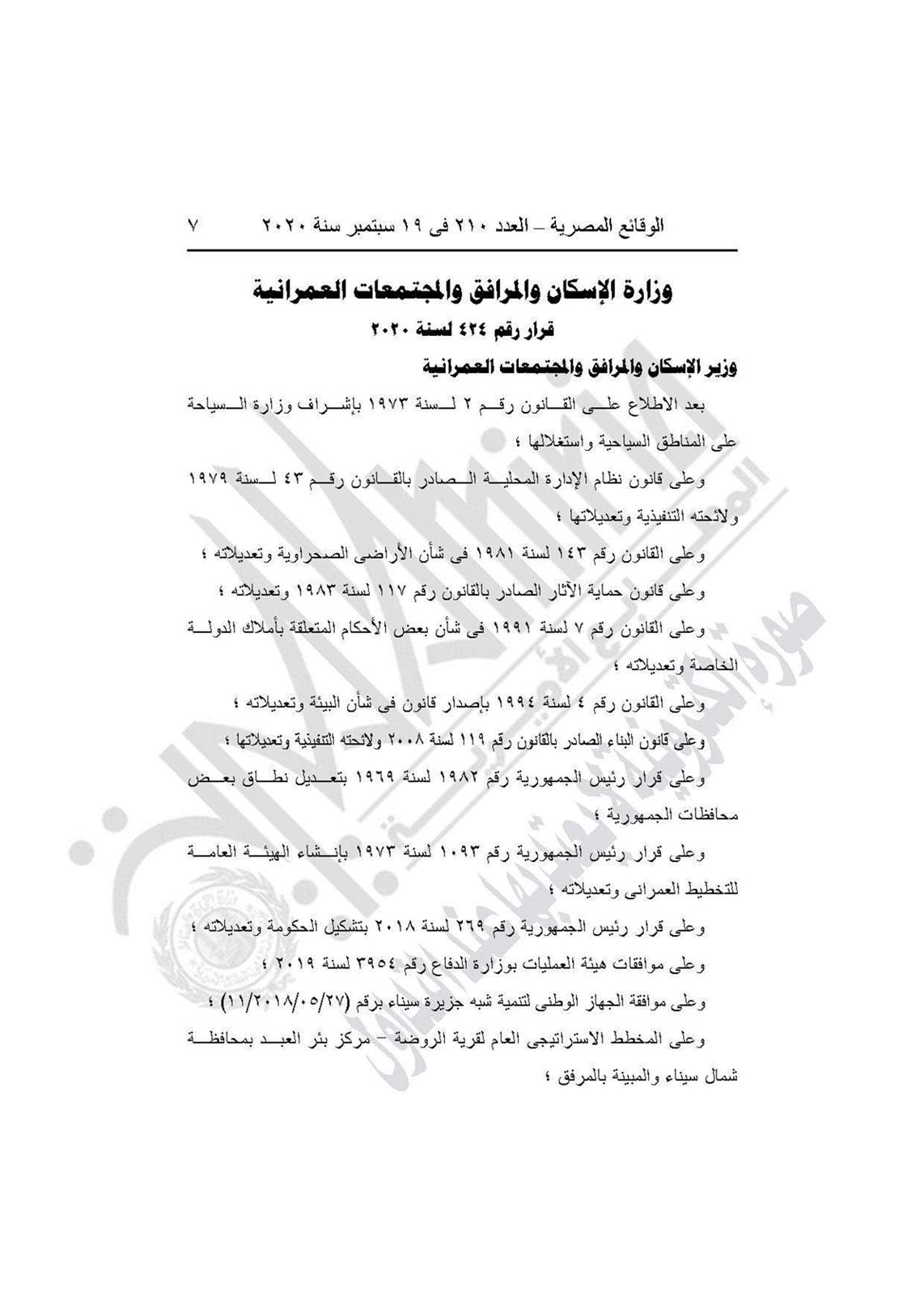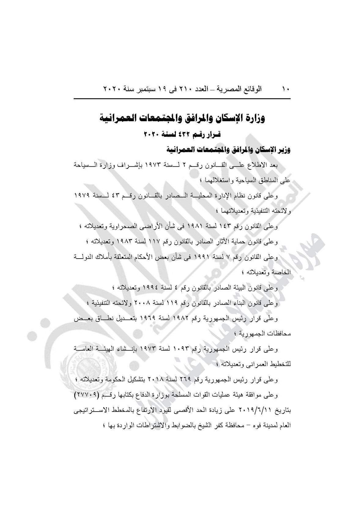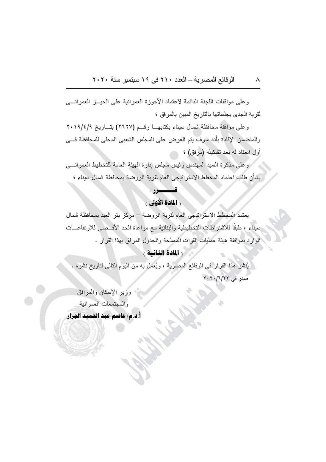 نشرت جريدة الوقائع المصرية في عددها رقم 210، الصادر في 19 سبتمبر 2020، 3 قرارات لوزارة الإسكان والمرافق والمجتمعات العمرانية، بشأن انقضاء الجمعية التعاونية للبناء والإسكان بمرسى مطروح، و باعتماد المخطط الاستراتيجي العام لقرية الروضة مركز بئر العبد بمحافظة شمال سيناء، واعتماد تعديل المخطط الاستراتيجي العام لمدينة فوه محافظة كفر الشيخ.