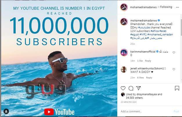 وجه الفنان محمد رمضان الشكر لجمهوره بعد وصول عدد مشتركي قناته الشخصية علي موقع الفيديوهات "يوتيوب" الى 11 مليون مشترك.