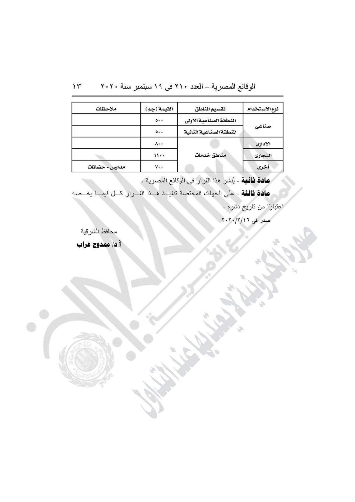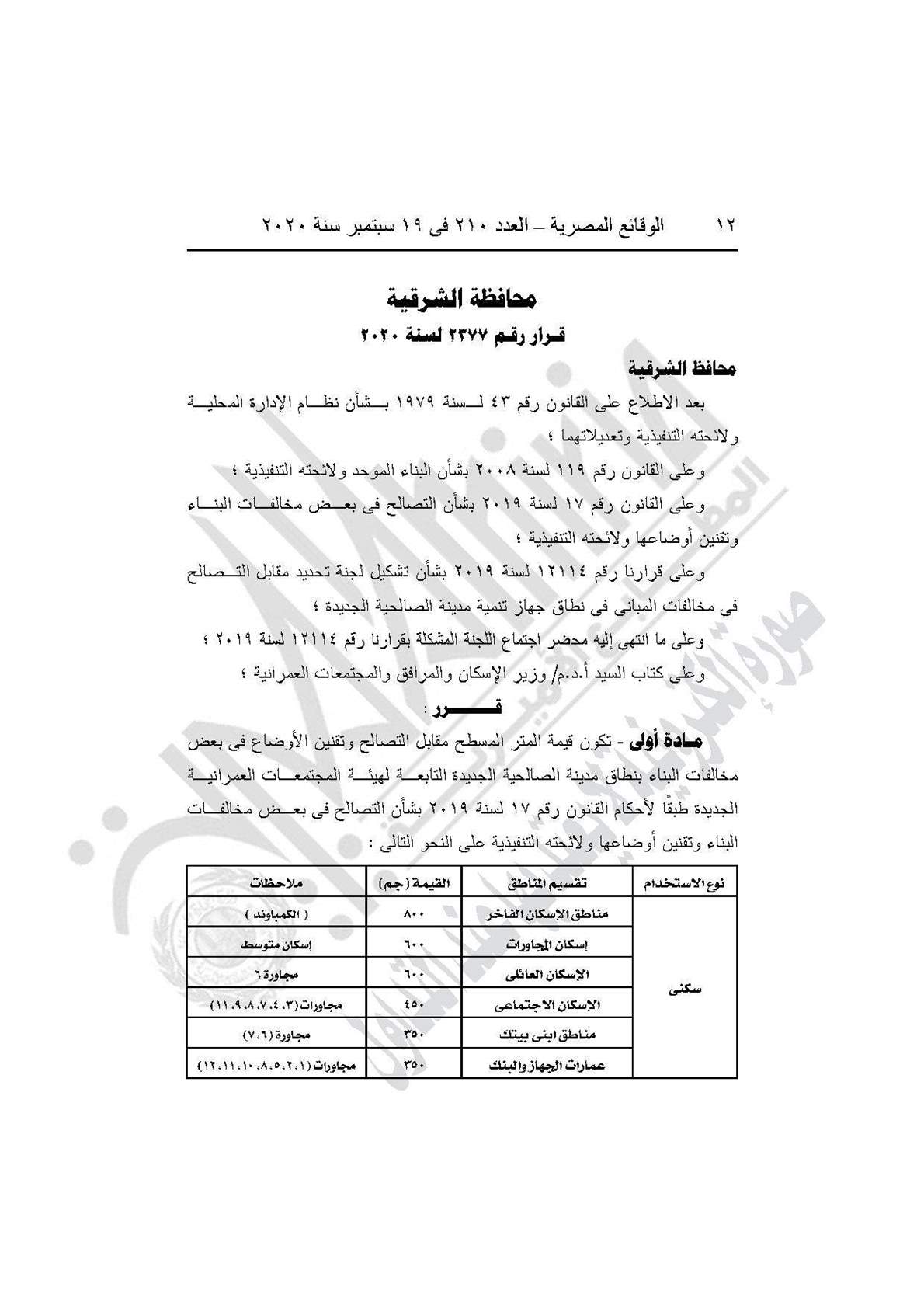 نشرت جريدة الوقائع المصرية في عددها رقم 210، الصادر في 19 سبتمبر 2020، قرار محافظة الشرقية رقم 2377 لسنة 2020، بشأن تحديد قيمة المتر المسطح مقابل التصالح وتقنين الأوضاع في بعض مخالفات البناء بنطاق مدينة الصالحية الجديدة.