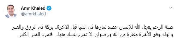 وكتب عمرو خالد تغريدة على تويتر "صلة الرحم يعجل الله للإنسان حصد ثمارها في الدنيا قبل الآخرة.. بركة في الرزق والعمر والولد.. وفي الآخرة مغفرة من الله ورضوان. لا تحرم نفسك منها.. فتحرم الخير الكثير"
