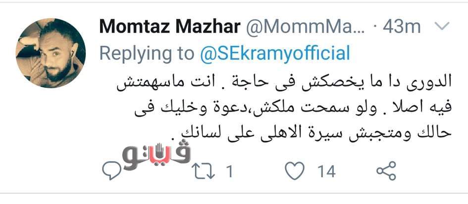 وقال أحد المتابعين للاعب : «الدوري ده مايخصكش فى حاجة .. إنت ماساهمتش فيه أصلا.. ولو سمحت ملكش دعوة وخليك فى حالك ومتجبش سيرة الأهلي على لسانك».