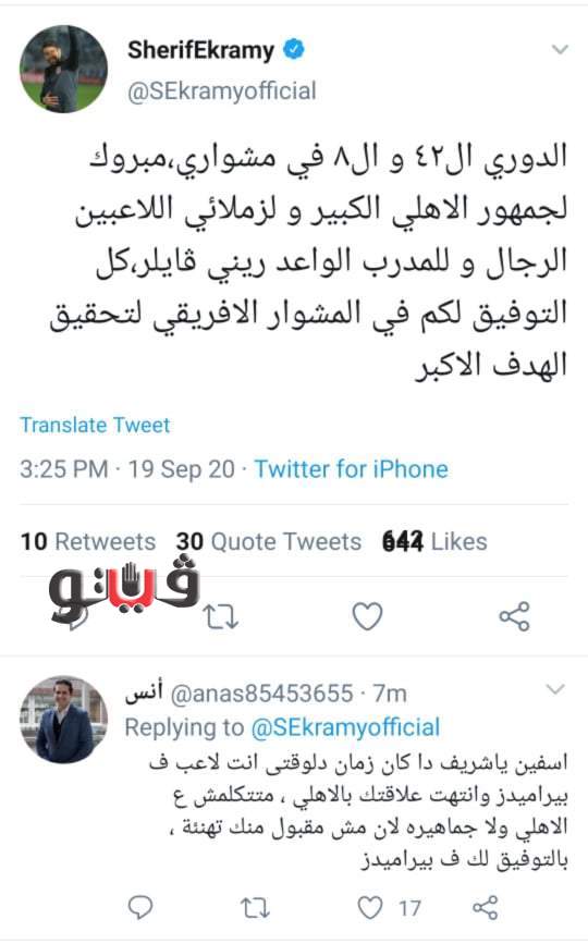 شنت جماهير النادي الاهلي هجومًا ضاريًا عبر موقع التغريدات الشهير تويتر ضد شريف إكرامي حارس مرمي الفريق السابق والمنضم الى صفوف بيراميدز بداية من الموسم القادم، وذلك ردًا على تهنئة اللاعب للأهلي بعد تتويجه رسميًا بالدوري رقم 42.