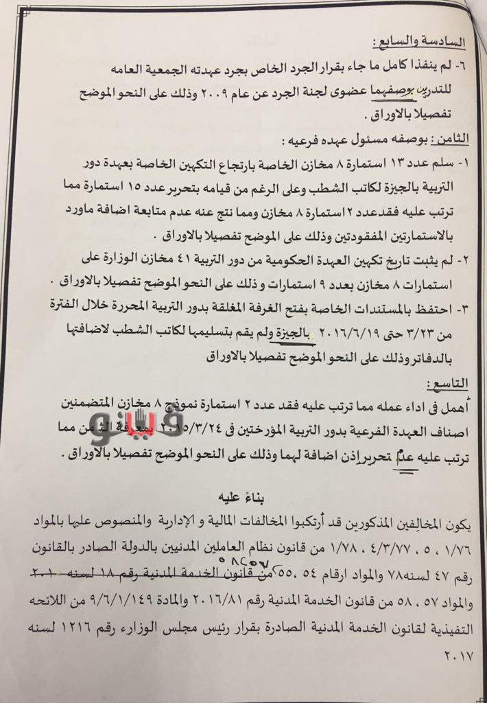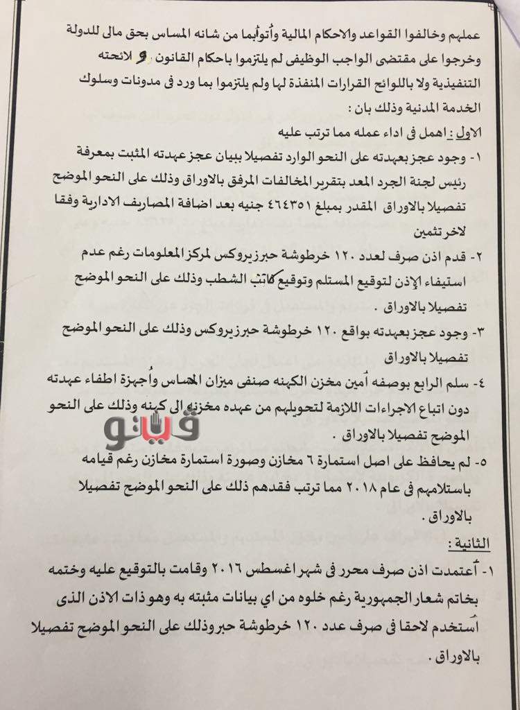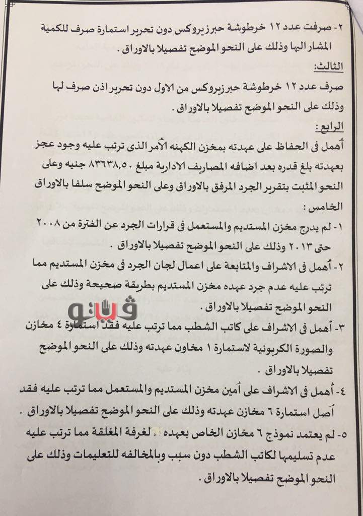 وقام سعيد أحمد أمين، موظف بقسم النظم والمعلومات بصرف عدد 12 خرطوشة حبرزيروكس من المحال الأول دون تحرير إذن صرف لها، وأهمل أشرف أحمد حسن، أمين مخازن قطع غيار السيارات والكهنة في الحفاظ على عهدته بمخزن الكهنة الأمر الذي ترتب عليه وجود عجز بعهدته بلغ قدره بعد اضافه المصاريف الإدارية مبلغ 84 ألف جنيه.