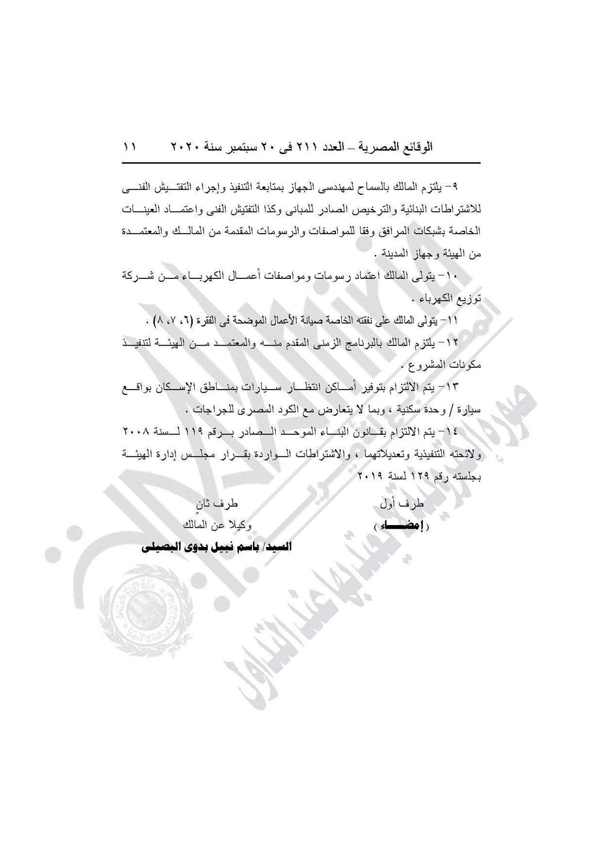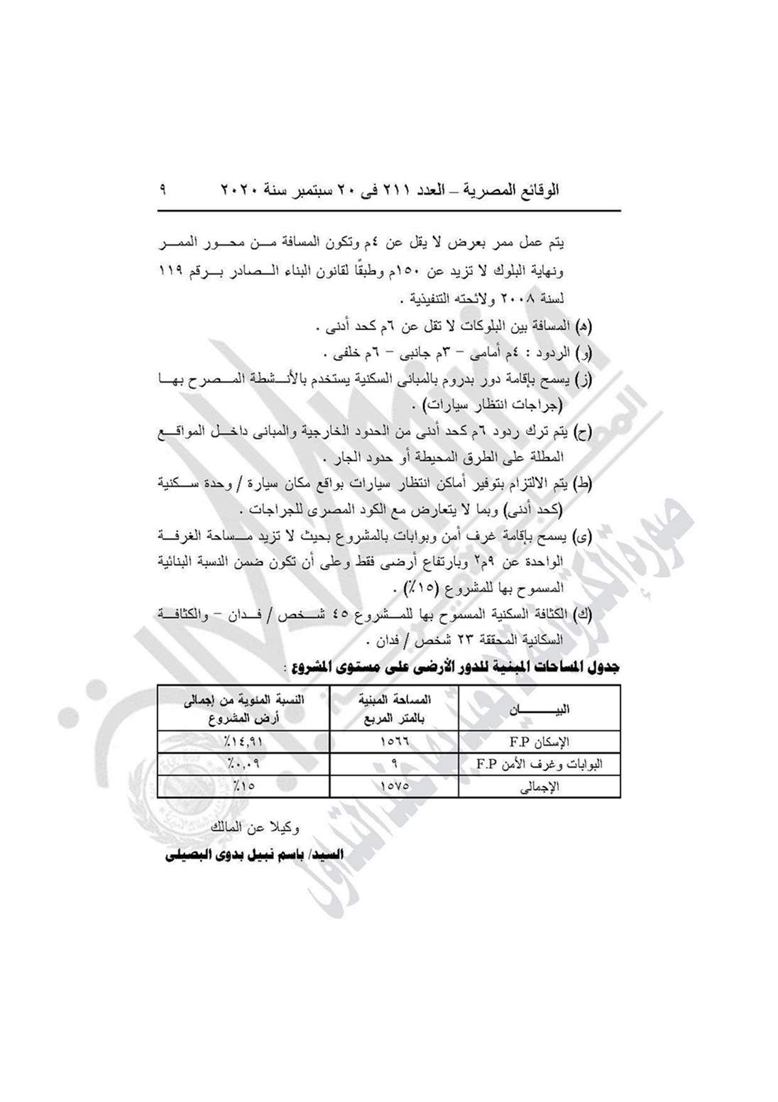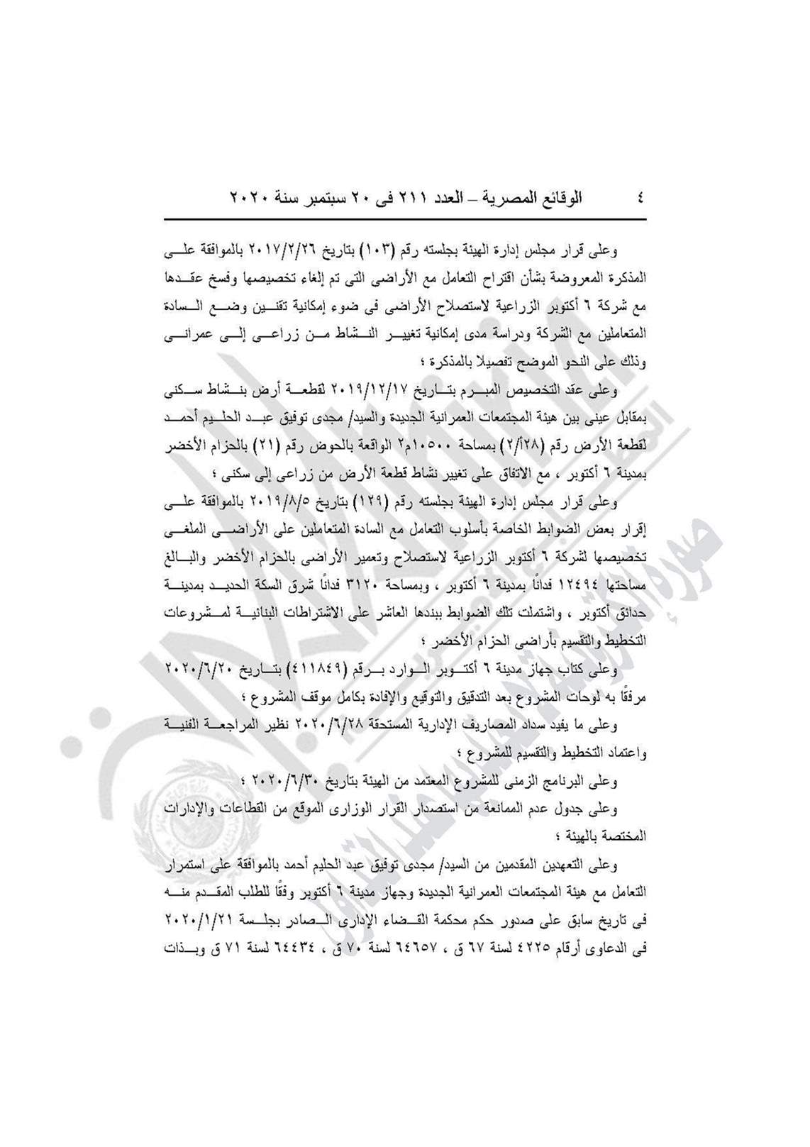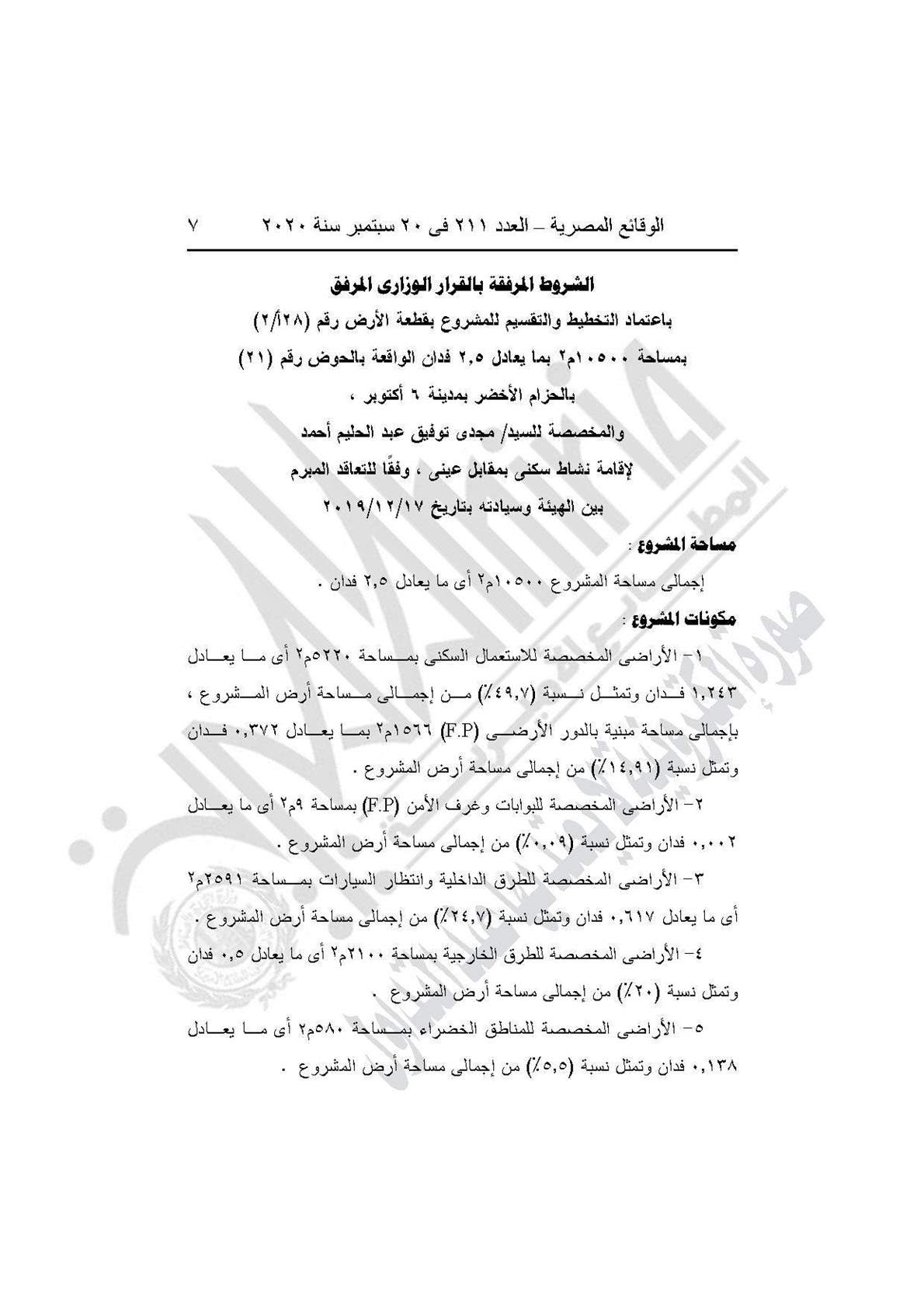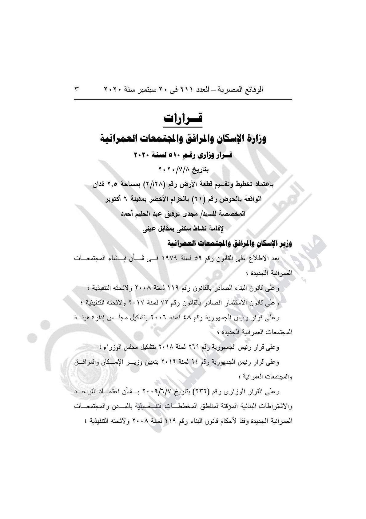 نشرت جريدة الوقائع المصرية في عددها رقم 211، الصادر في 20 سبتمبر 2020، قرار وزارة الإسكان والمرافق والمجتمعات العمرانية رقم 510 لسنة 2020، بشأن اعتماد تخطيط وتقسيم قطعة الأرض رقم (28أ/2) بمساحة 2.5 فدان، الواقعة بالحوض رقم (21) بالحزام الأخضر بمدينة 6 أكتوبر المخصصة لمجدي توفيق عبد الحليم أحمد، لإقامة نشاط سكني بمقابل عيني.