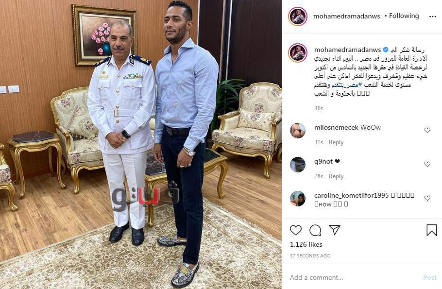 وعلق رمضان على الصورة الذى نشرها عبر حسابه الرسمي على موقع "الصور" الشهير "انستجرام" قائلاً :"رسالة شكر الى الادارة العامة للمرور في مصر .. اليوم اثناء تجديدي لرخصة القيادة في مقرها الجديد بالسادس من اكتوبر شيء عظيم ومُشرف ويدعوا للفخر اماكن على أعلى مستوى لخدمة الشعب مصر بتتقدم وهتتقدم بالحكومة و الشعب”.