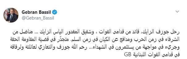 وكتب جبران باسيل تغريدة على تويتر قال فيها: "رحل جوزف الزايك، قائد من قدامى القوات ، وشقيق المغدور الياس الزايك... مناضل من الشرفاء في زمن الحرب ومدافع عن الكيان في زمن السلم. متجذّر في قضية المقاومة الحقة وجريء في مواجهة من يستثمرون في الشهداء... رحم الله جوزف والتعازي لعائلته ولرفاقه في قدامى القوات اللبنانية GB"