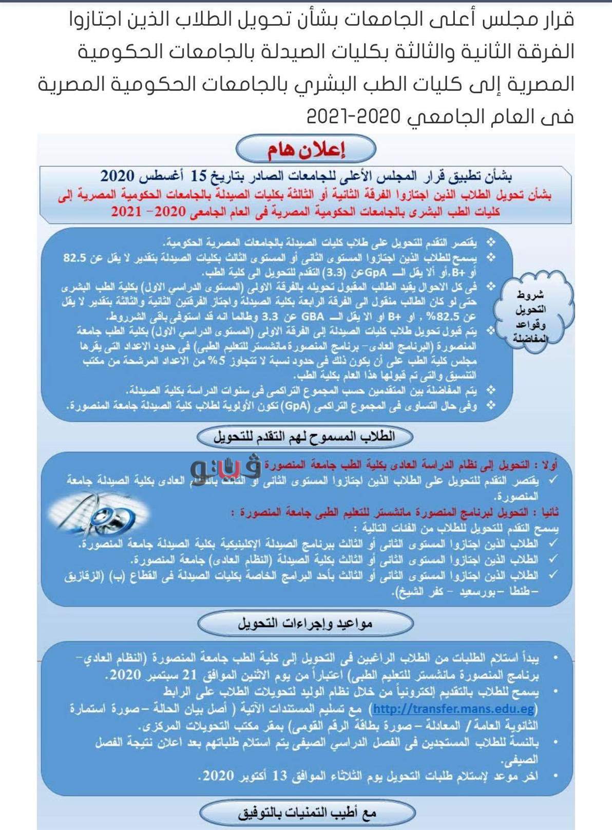 أعلن رئيس جامعة المنصورة عن تطبيق قرار المجلس الأعلى للجامعات بشأن تحويل الطلاب الذين اجتازوا الفرقة الثانية والثالثة بكليات الصيدلة بالجامعات الحكومية المصرية إلى كليات الطب البشري بالجامعات الحكومية المصرية في العام الجامعي 2020-2021.