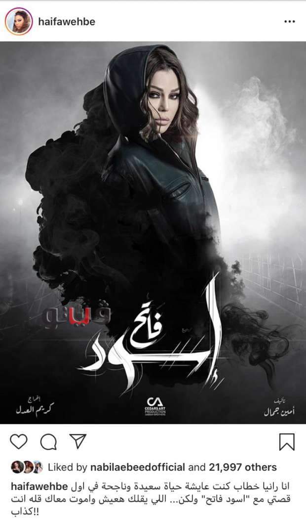 وعلقت هيفاء على الصورة المنشورة يكشف عن شخصيتها في المسلسل، كتبت قائلة: "أنا رانيا خطاب كنت عايشة حياة سعيدة وناجحة في أول قصتي مع (أسود فاتح) ولكن.. اللي يقولك هعيش وأموت معاك قل له أنت كذاب".