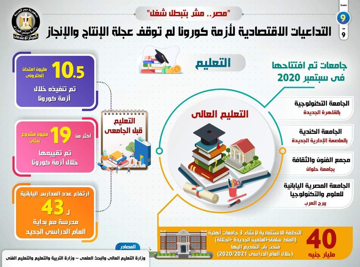 وأخيراً بشأن قطاع التعليم، أوضح التقرير، أنه فيما يتعلق بالتعليم العالي، فقد تم افتتاح عدد من الجامعات في سبتمبر 2020 وهي (الجامعة التكنولوجية بالقاهرة الجديدة- الجامعة الكندية بالعاصمة الإدارية الجديدة- مجمع الفنون والثقافة بجامعة حلوان- الجامعة المصرية اليابانية للعلوم والتكنولوجيا ببرج العرب)، كما بلغت التكلفة الاستثمارية لإنشاء 3 جامعات أهلية وهم (الملك سلمان–العلمين الجديدة –الجلالة)، 40 مليار جنيه، وقد تم فتح باب التقديم إليها خلال العام الدراسي 2020/2021.