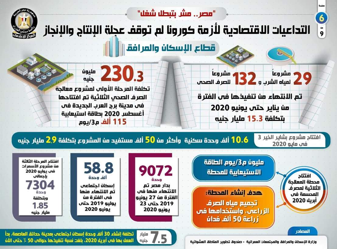 أما فيما يتعلق بقطاع الإسكان والمرافق، فقد رصد التقرير، أن تكلفة المرحلة الأولى لمشروع معالجة الصرف الصحي الثلاثية التي تم افتتاحها في مدينة برج العرب الجديدة في أغسطس 2020، بطاقة استيعابية 115 ألف م3/ يوم، بلغت 230.3 مليون جنيه، كما تم الانتهاء من تنفيذ 29 مشروعاً لمياه الشرب، و132 مشروعاً للصرف الصحي في الفترة من يناير حتى يونيو 2020، وذلك بتكلفة 15.3 مليار جنيه، وكذلك افتتاح مشروع بشاير الخير3، في مايو 2020 بتكلفة 2.9 مليار جنيه، يضم 10.6 ألف وحدة سكنية.